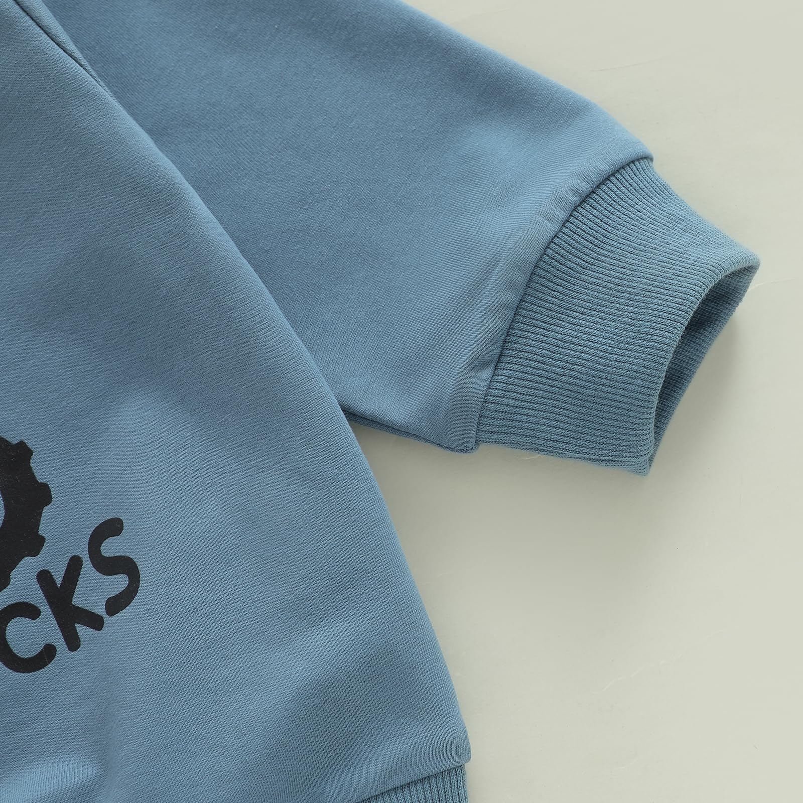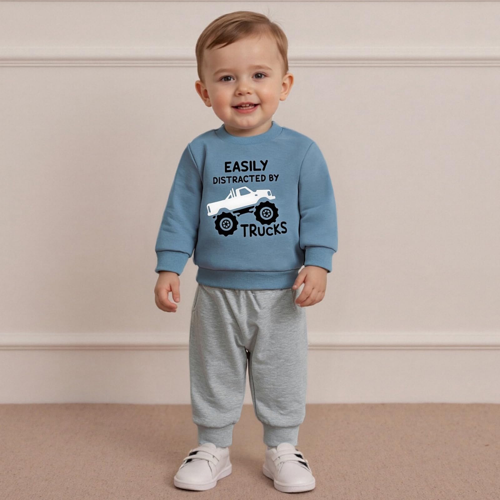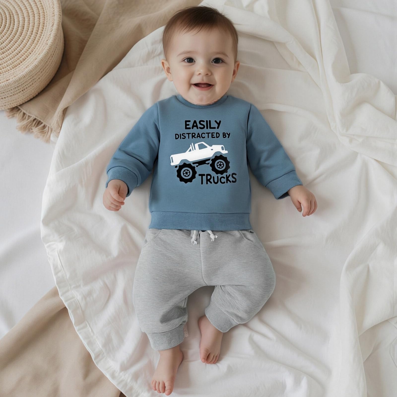 Design: toddler boy long sleeve pullover sweatshirt, 'easily distracted by trucks' letter print & solid color joggers pants set with pockets.Toddler baby boy sweatsuit perfect for spring, autumn and winter casual wear