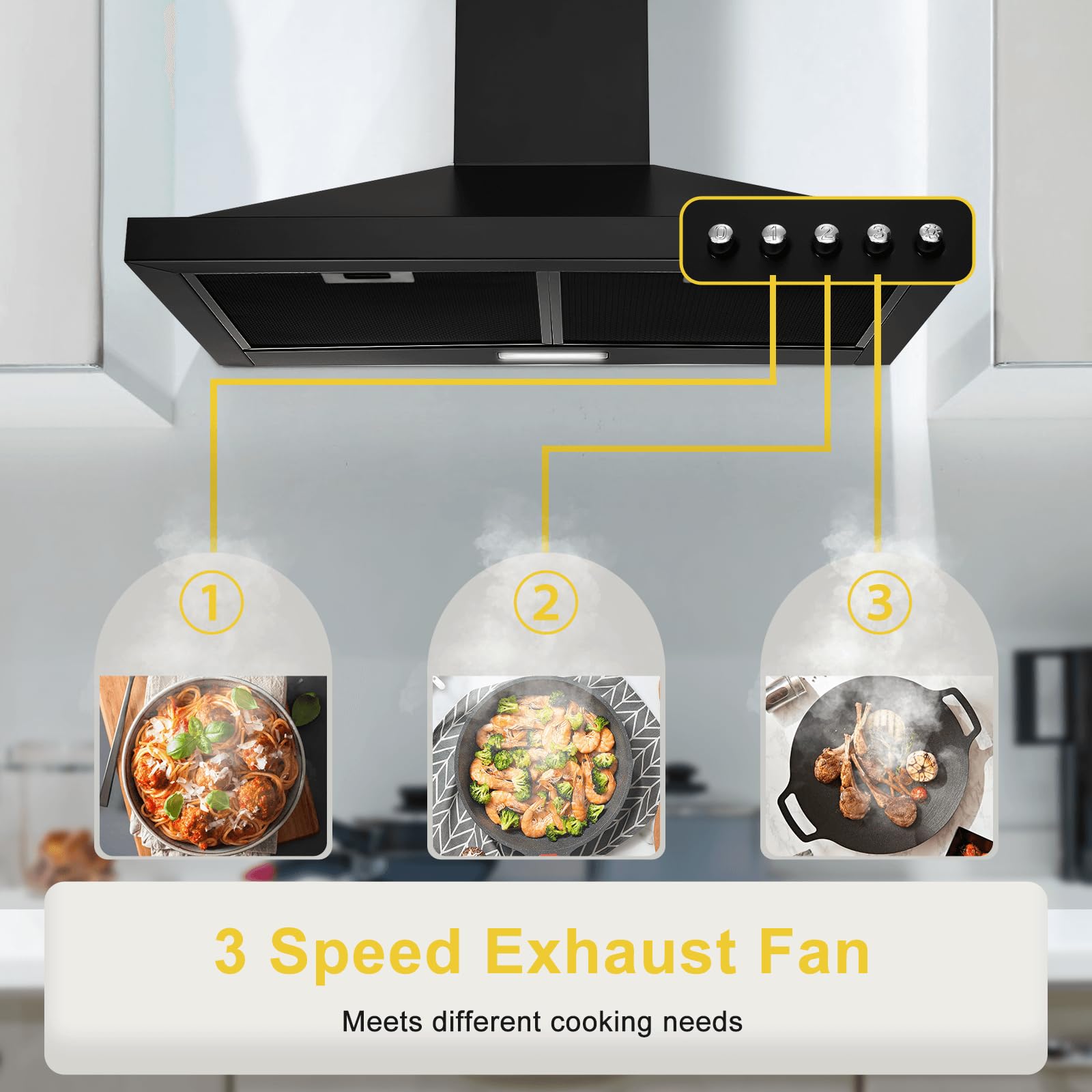 【Kitchen Vent Hood 30 inches】:Powerful 450 CFM airflow with 3-speed push button controls(Low, Mid, and High), noise of range hood fan less than 55dB at the highest speed. LED light can be turned on individually when range hood is not activated,provides extra light you may need when cooking. 30 inch range hood can fit most kitchen space.