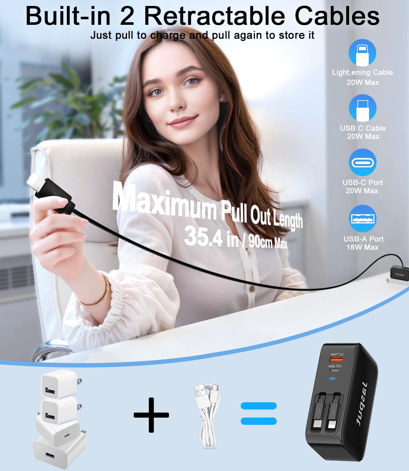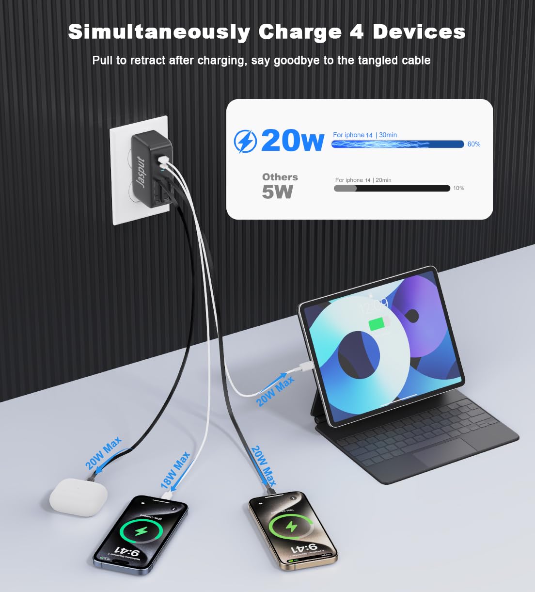 【4-in-1 design】2025 upgraded 4 in 1 retractable charger wall plug has built-in dual retractable cables (a light,ening port cable + a usb-c port cable), a QC 18W usb port and a PD 20w type-c port. Its various charging interfaces can meet our daily charging needs to the greatest extent. And retractable functions can be easy to organize and carry, Ideal for home, office,travel essentials.