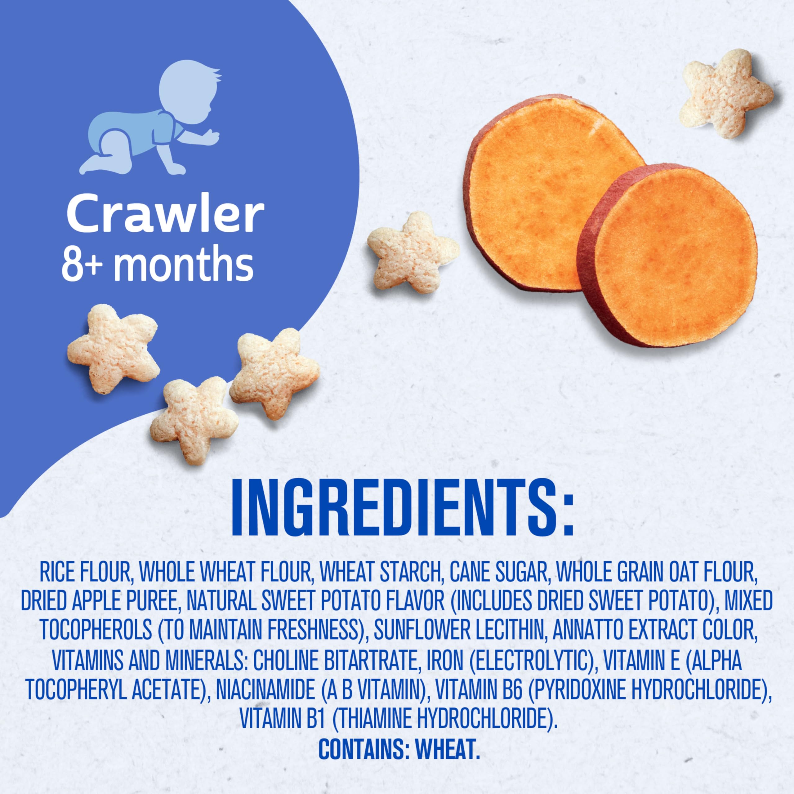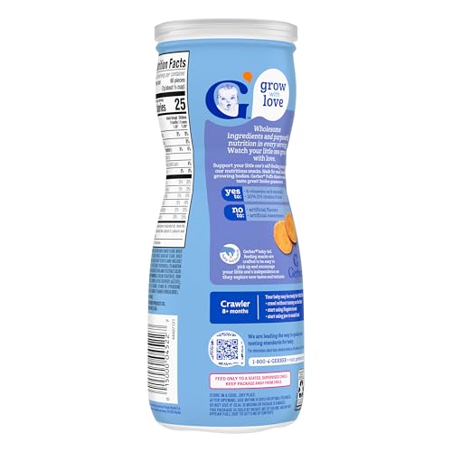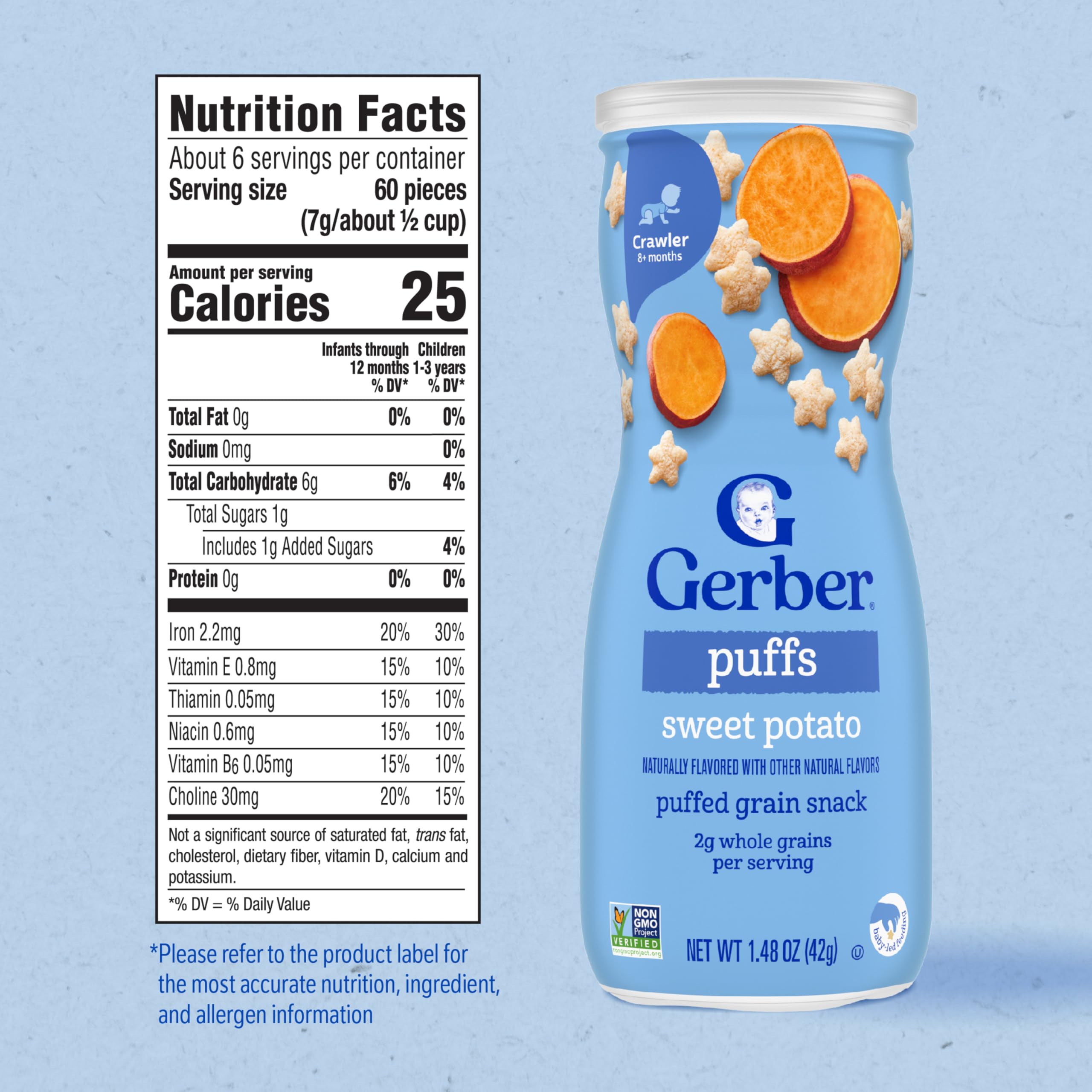 Gerber sweet potato puffs baby snacks are made with wholesome ingredients and strict quality standards just for babies. This baby finger food dissolves easily and is perfect for little hands learning to pick things up, while also encouraging self-feeding and independence. Specially crafted to delight your little one, these sweet potato puffs are a stage 3 baby food and have been designed for babies 8 months and older. Gerber understands the importance of providing nutritious food as your baby grows and develops. That’s why our dedication to quality and nutrition has been and always will be our highest priority. We're committed to being your partner in parenthood with strict quality standards, nutritious food & expert guidance. Gerber Puffs are a trusted choice for countless families.