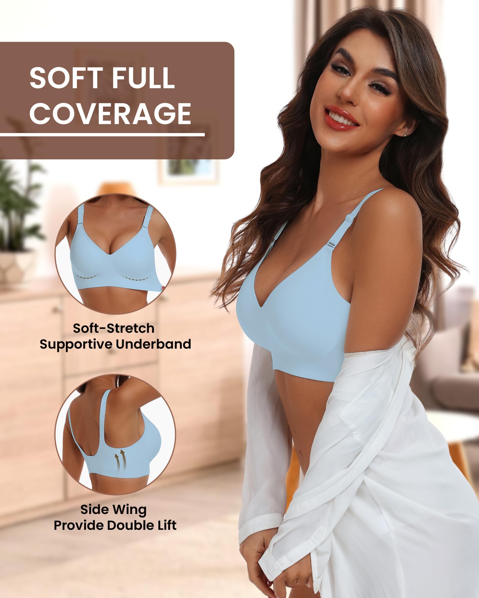 Jelly Wireless Push Up Bras:This jelly bras for women feature innovative W-shaped "Jelly Bands" and 3D molded cups, paired with a fully seamless construction that fits your body like a second skin. The flattering V-neck cut accentuates natural curves for a subtle push-up effect, while the stitch-free design eliminates friction and irritation. As wireless bras for women, it blends stylish shaping with unrestricted freedom of movement