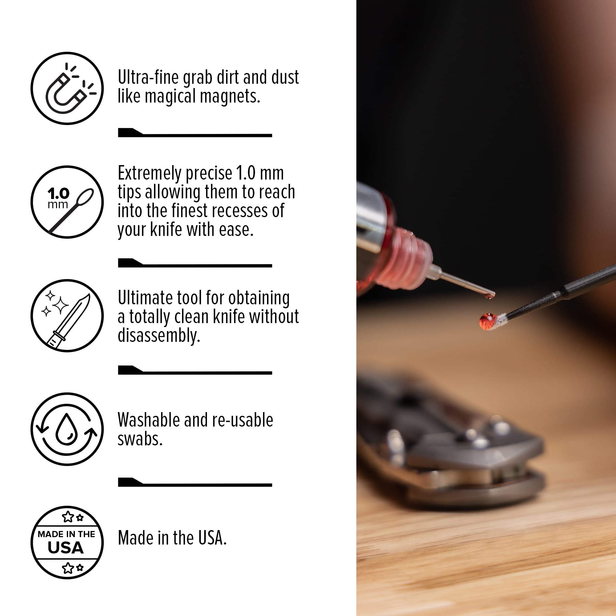 ๐ช MADE FOR KNIVES: Cleaning swabs are tough on residue and ideal for a quick, thorough clean-up of hard-to-reach areas. Pocket knives are unique in that they are exposed to tons of harmful dirts, salts, and abrasive particles daily. A fine swab tip is perfect for reaching delicate areas, and they leave no fiber residue.