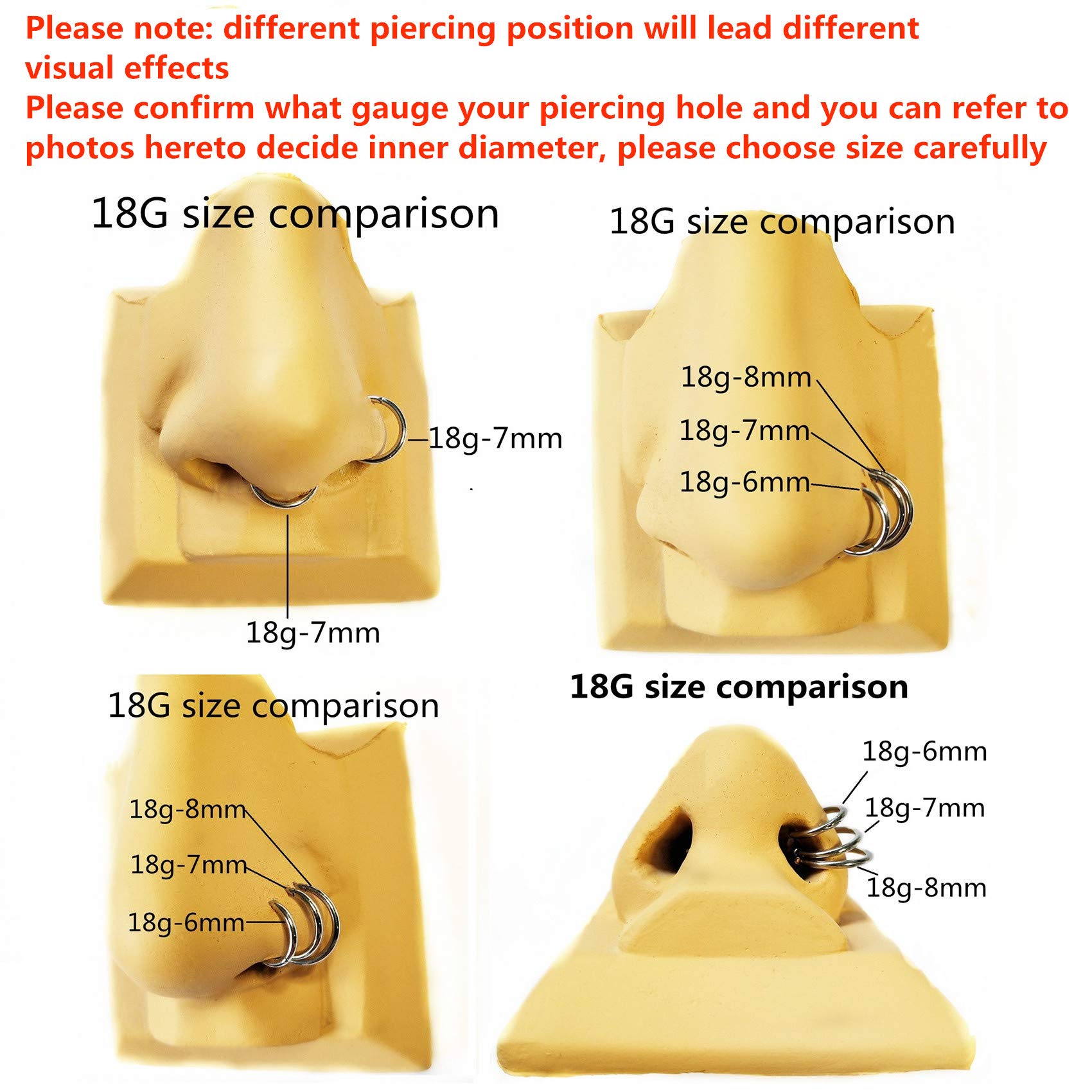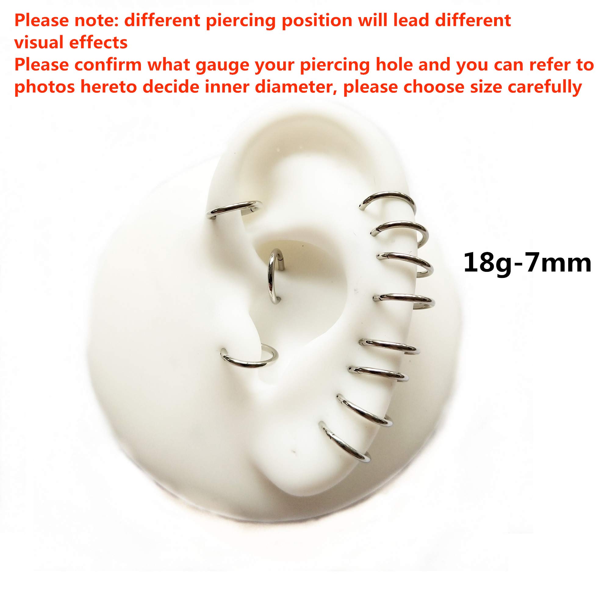 Sold individually Nose Hoop Ring/Earring Hoop Size: 18 gauge (thickness: 1.0mm), inner diameter 9/32 inches(7mm),Please choose your gauge and diameter hoop for your nose piercing needs.It has a smooth closure that doesn't slipped or opened. It's still tight after long-term use.