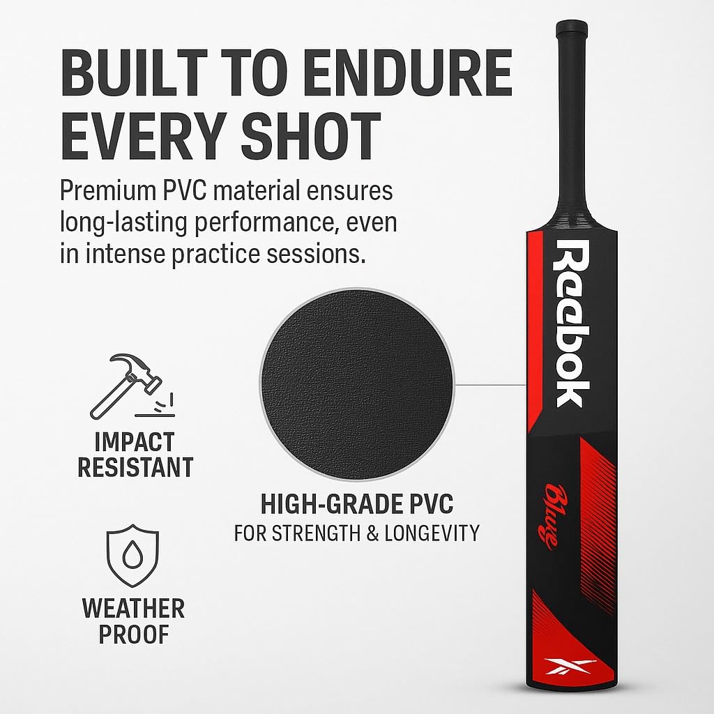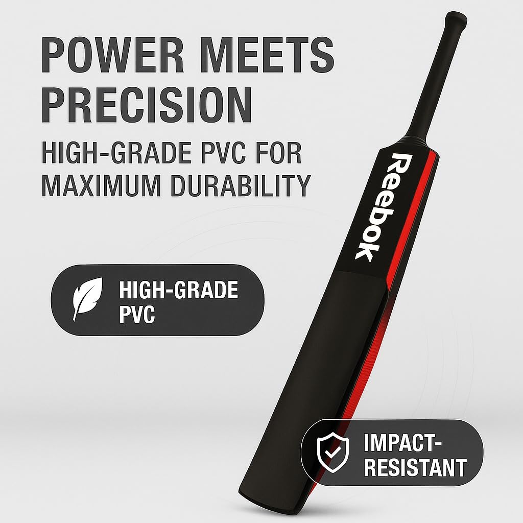 This Reebok cricket bat from the Blaze Series is perfect for aspiring young players. Made from durable plastic, it is lightweight and easy to wield for developing batting skills. The rounded edges and smooth finish ensure safe play even for first-timers. At 34 inches long, meets standards for quality and performance. Suitable for both outdoor practice and indoor nets. Comes in solid black color for an understated look. High-grade PVC Plastic This cricket bat is made from high-grade PVC plastic material and offers durability and performance. This PVC construction provides a comfortable grip and easy maintenance and makes these bats ideal for recreational games and professional matches. This material is known for its strength and resistance and ensures longevity during intense play sessions. Advanced Playing Level The advanced design of this bat ensures reliability and effectiveness and makes it a favourite choice for skilled players. It is crafted with performance and precision in mind. This bat is finely balanced for quick and optimised stroke play and meets the demands of competitive cricket. It also enhances the power and control during batting. Easy to Wield This cricket bat is designed for easy wielding and offers lightweight construction and ergonomic handles for effortless control. This bat is ideal for both beginners learning the game and also seasoned players trying to refine their skills. This bat also ensures a comfortable grip and a balanced swing and enhances the performance of the player in action Suitable for All Ball Types These plastic bats are versatile and are suitable for all types of balls used in the game. This feature makes these bats a practical choice for players of all ages and skill levels and ensures enjoyment and practice with different ball types. They also allow to withstand impacts from various types of cricket balls and include tennis balls and soft rubber balls typically used in training sessions and casual games. Rounded Edges The cricket bats feature rounded edges and offer improved performance and safety during matches and games. These rounded edges contribute to a comfortable grip and feel, enhance the overall batting experience, and minimise potential injury risks. This feature also enhances the bat's aerodynamics and enables players to execute shots with great precision and control.