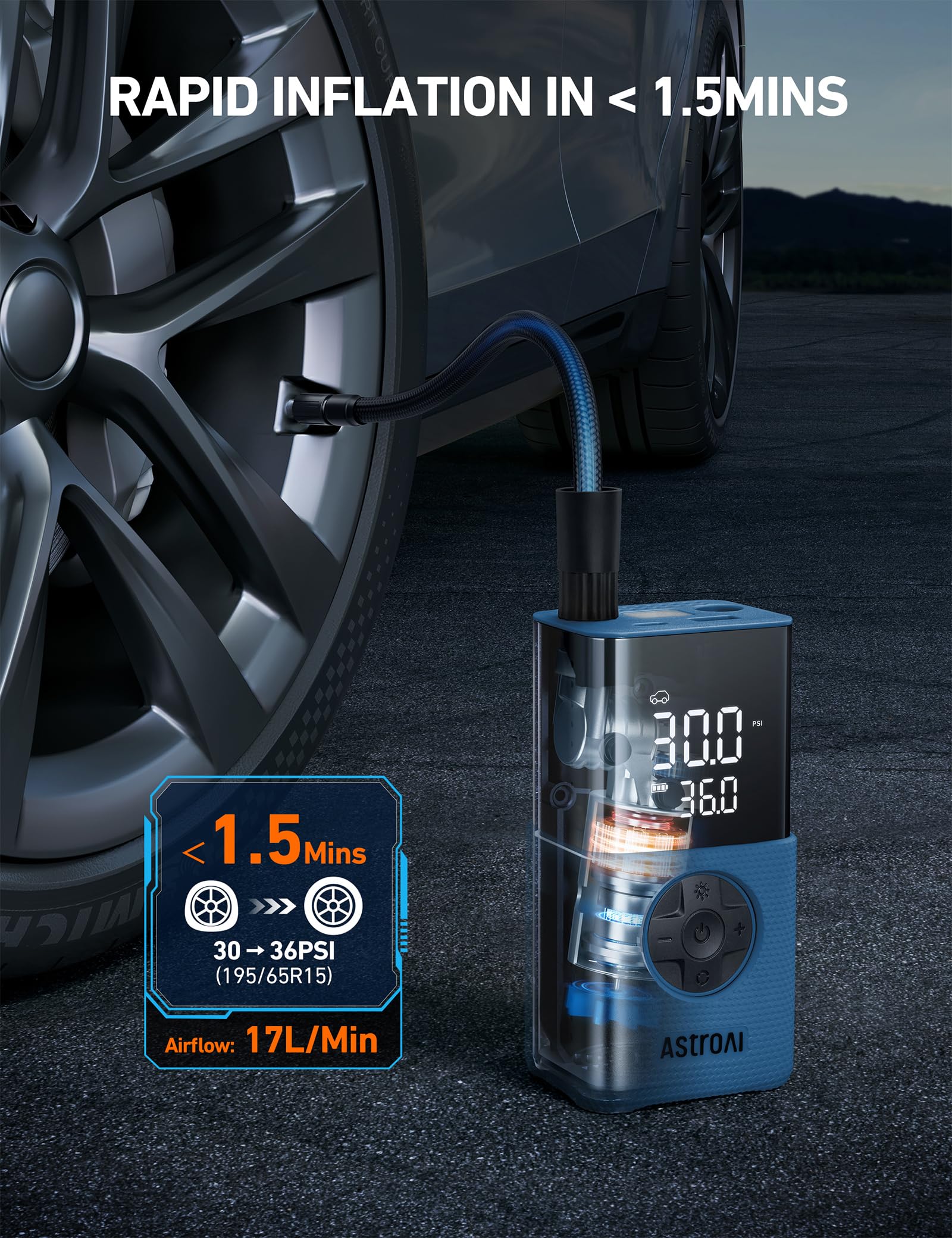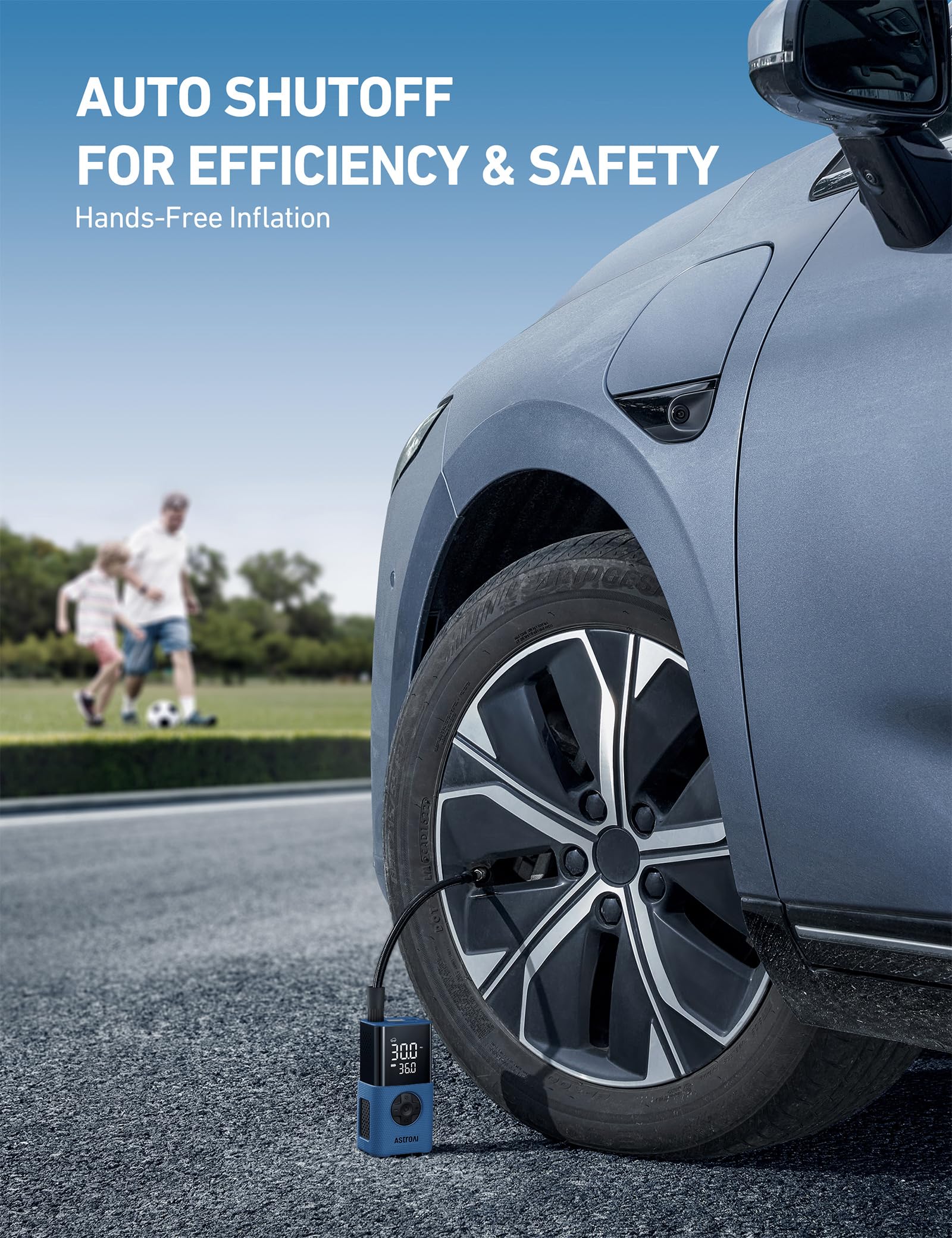 LONG RUNTIME & AUTO-OFF: After fully charging, the built-in 4000mAh large-capacity battery allows the air compressor to refill up to 8 tires (195/65R15) from 30-36PSI. The preset function and auto-off function deliver a hands-free inflation experience. With just one press, the air compressor will easily inflate car tires, motorcycle tires, bicycle tires, balls, and more. (Note: Incompatible with heavy-duty tires, like those on offroad vehicles, RVs, trucks, and trailers.)