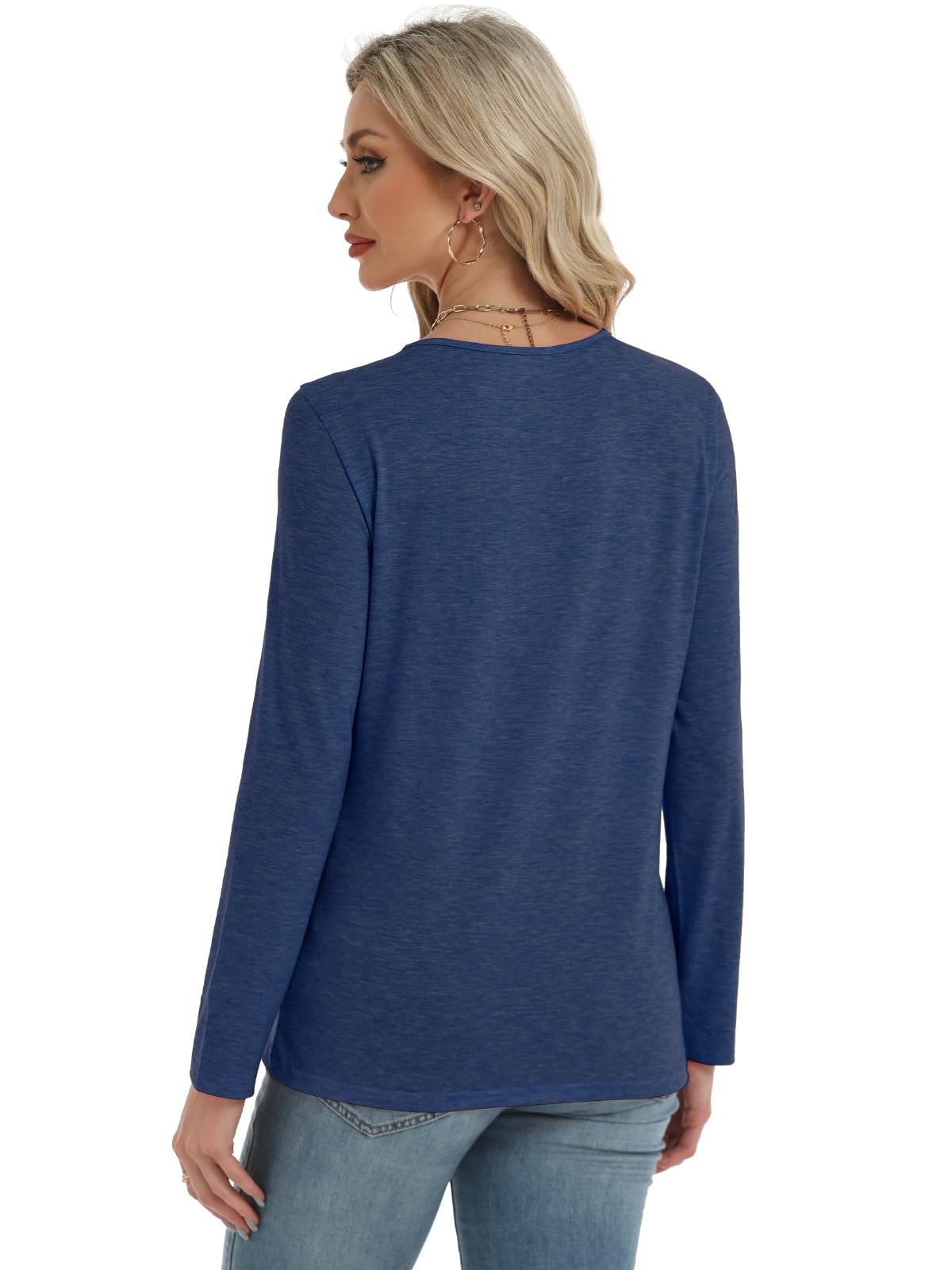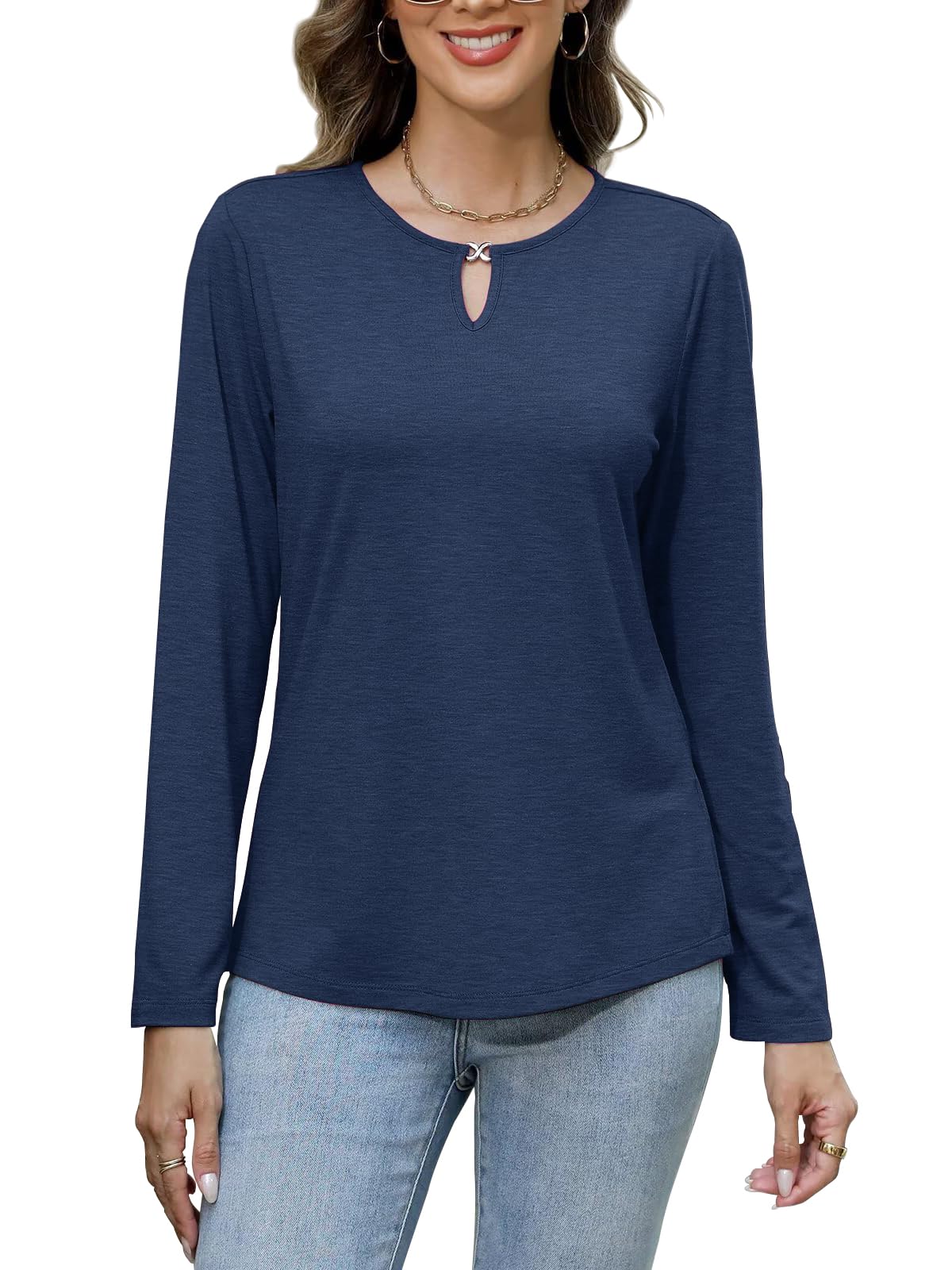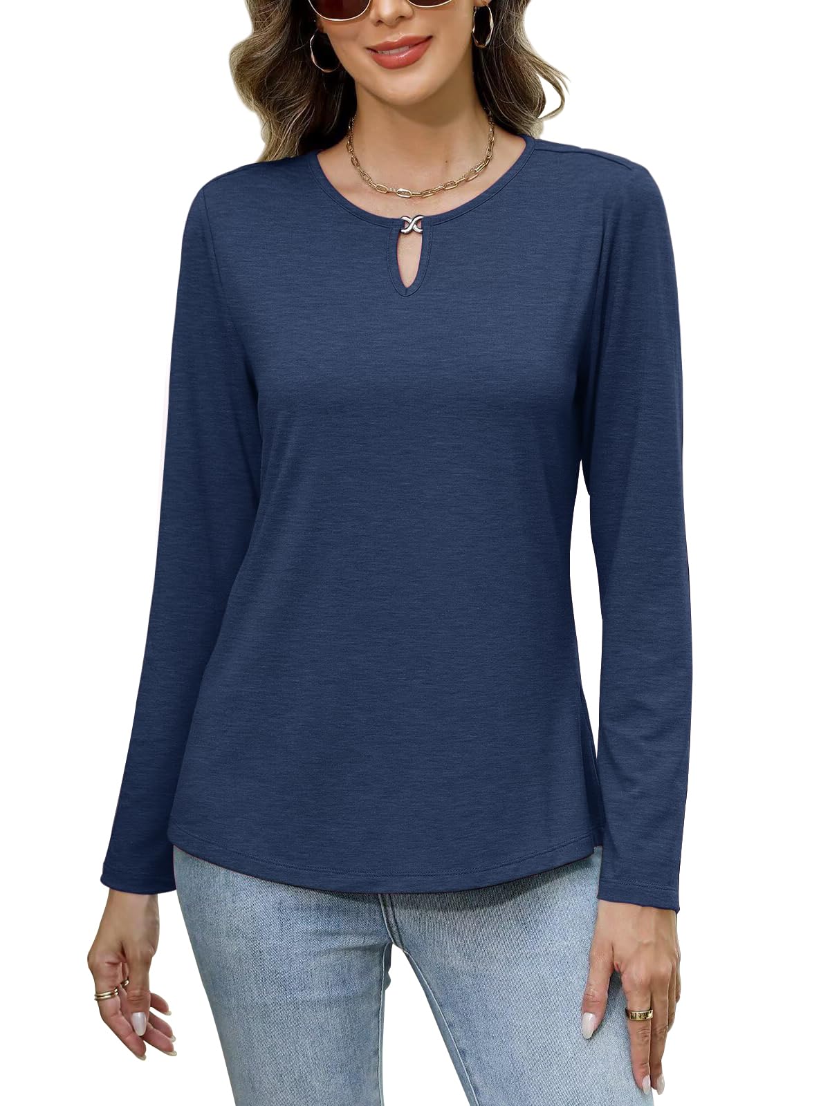 Unique Design: This elegantly designed long sleeve tops for women features a stylish round neckline with a decorative metal buckle and a slightly exposed collar, adding a touch of allure to your fall wardrobe and highlighting your personal fashion sense. loose-fitting women tops design offers a comfortable and flattering silhouette, making it ideal for casual and trendy outfits.