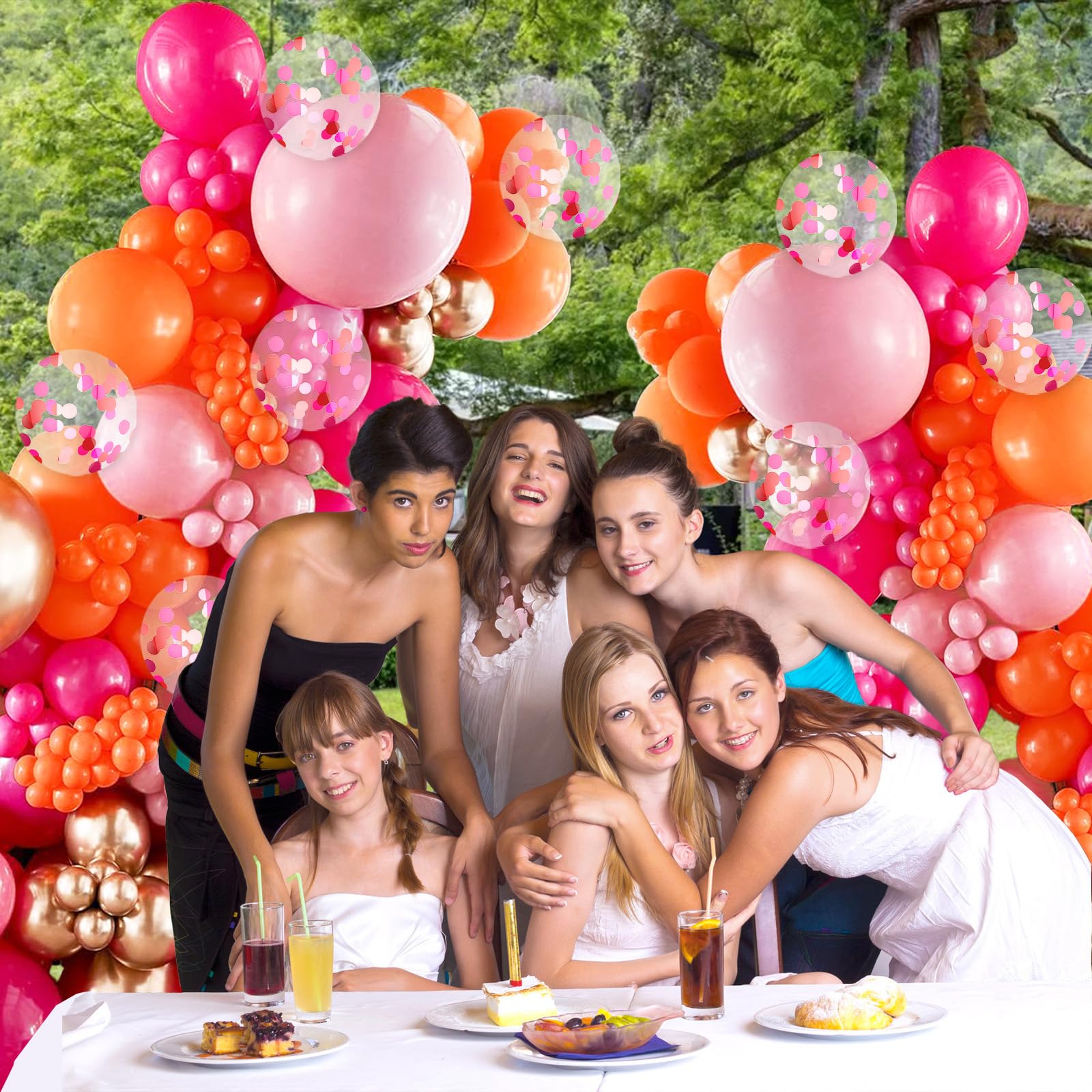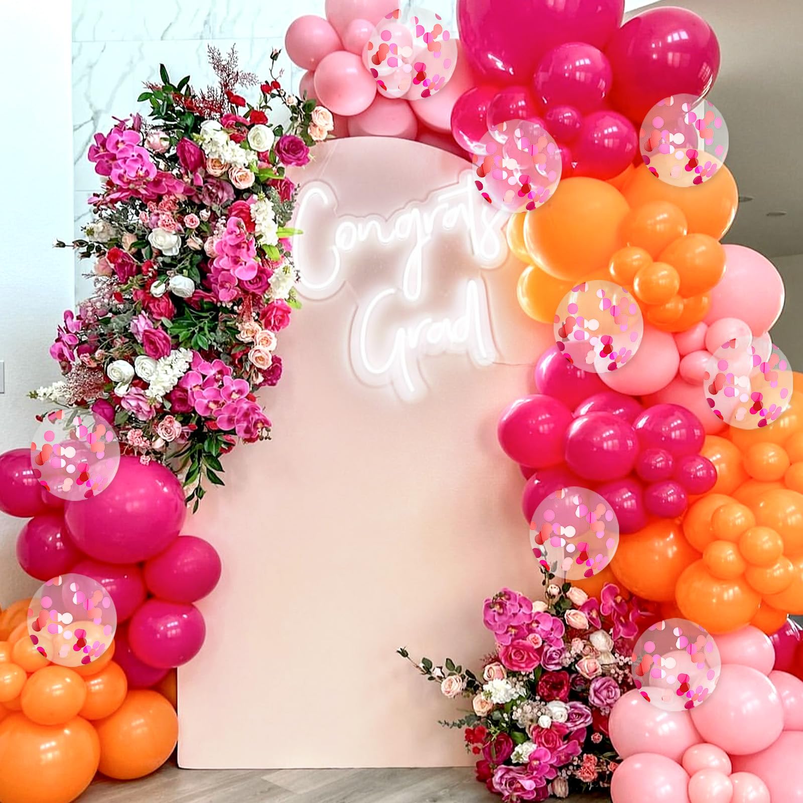 Package Includes: The orange and pink party decorations include 12 inch hot pink balloonsx20, 12 inch orange balloonsx20, 12 inch light pink balloonsx10, 12 inch pink and orange confetti balloonsx10, ribbonx1, glue dotsx20