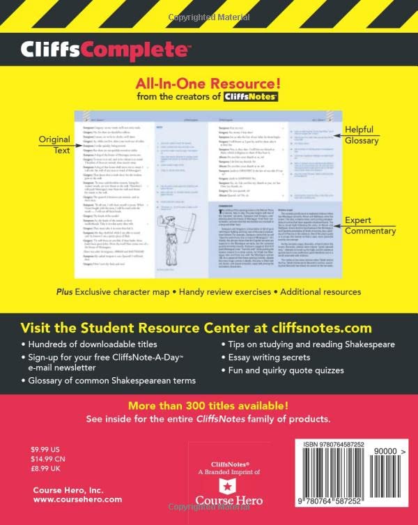 In the CliffsComplete guides, the novel's complete text and a glossary appear side-by-side with coordinating numbered lines to help you understand unusual words and phrasing. You'll also find all the commentary and resources of a standard CliffsNotes for Literature. CliffsComplete A Midsummer Night’s Dream has long been one of Shakespeare’s most popular plays. Its magical atmosphere, farcical plot, hilarious play-within-a-play, and general air of celebration have been enjoyed by nearly every generation since it was written. Everything is not what it seems in this play. Stay on top of what’s really going on — and save valuable studying time — all at once. Enhance your reading of A Midsummer Night’s Dream with these additional features: A summary and insightful commentary for each act Bibliography and historical background on the author, William Shakespeare A look at the historical context and structure of the play Discussions on the play’s symbols and themes A character map that graphically illustrates the relationships among the characters Review questions, a quiz, discussion topics (essay questions), activity ideas A ResourceCenter full of books, articles, films, and Internet sites Streamline your literature study with all-in-one help from CliffsComplete guides!