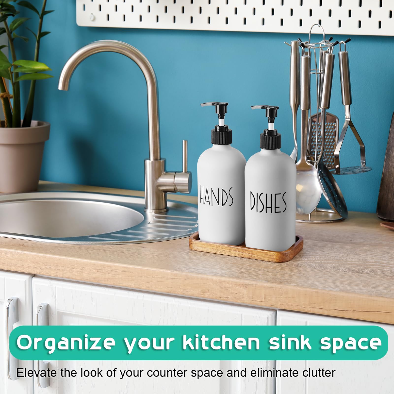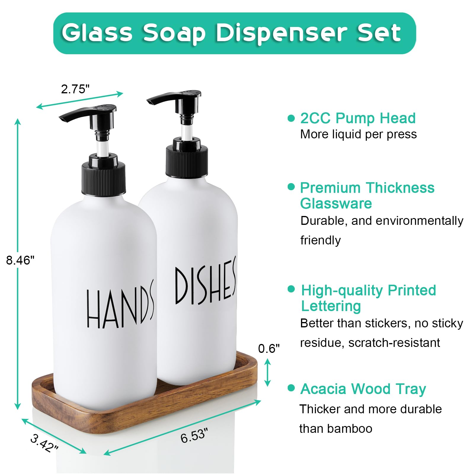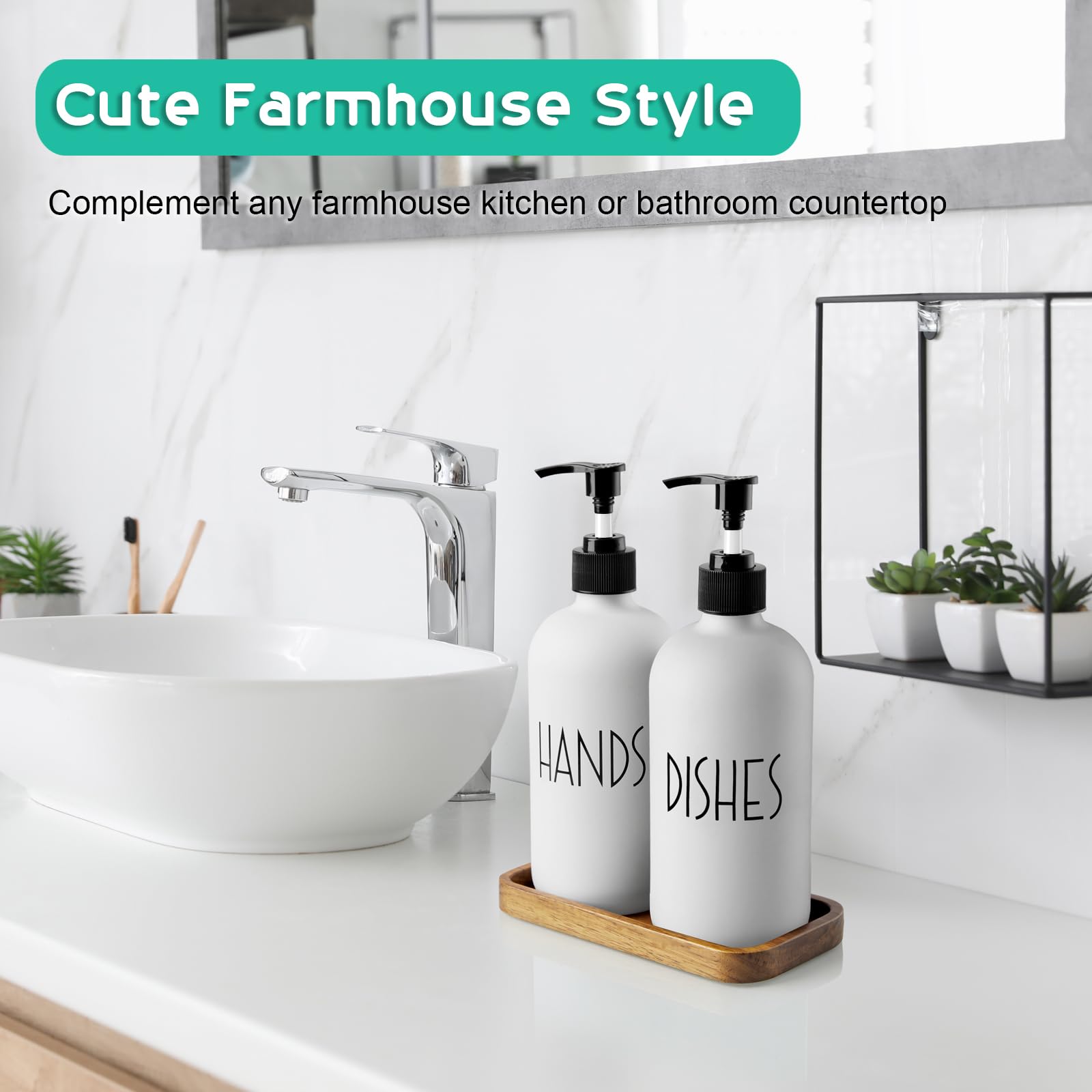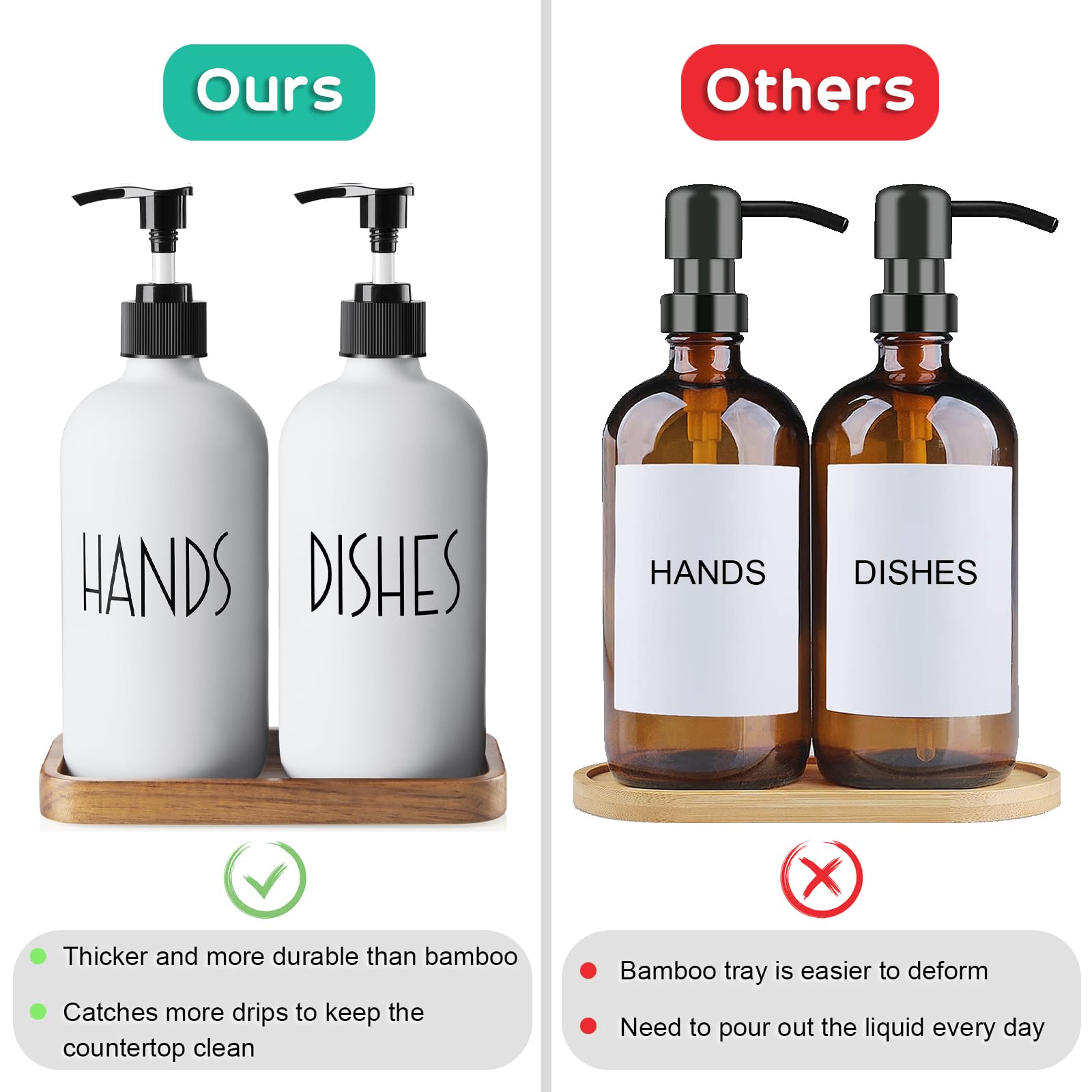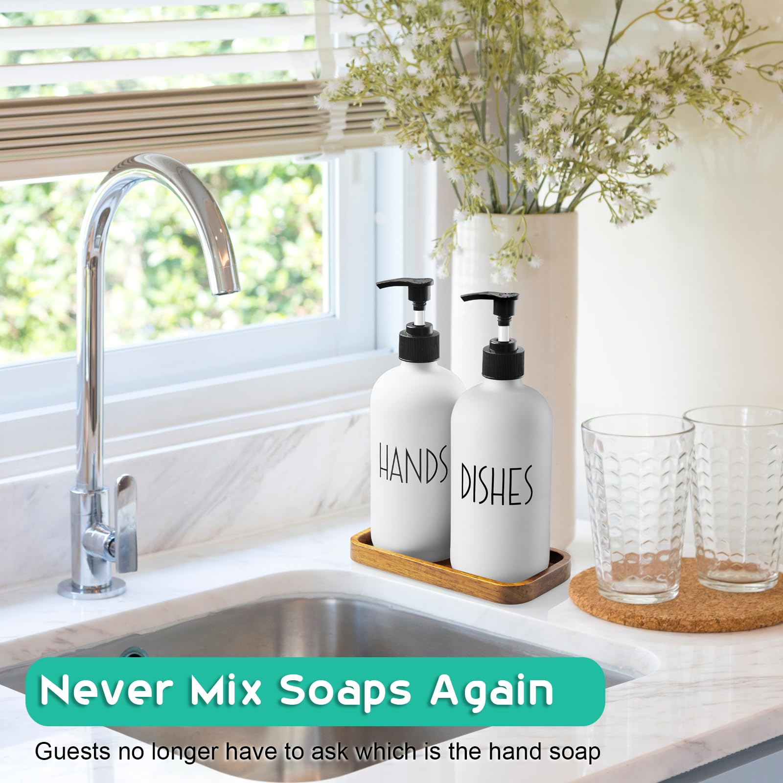 CLEARLY LABELED FOR EASY IDENTIFICATION – Say goodbye to mix-ups! This soap dispenser set features beautifully silkscreened labels that won’t peel off like paper ones, making it easy for your guests to tell the difference between soap and hand wash