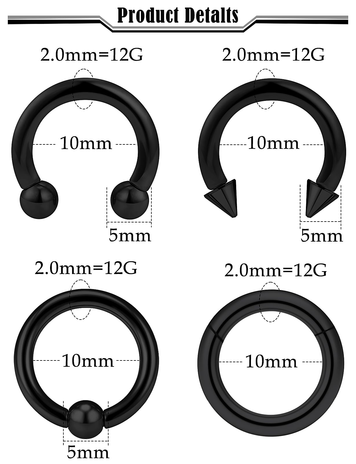 Gauges Earrings Size Specification: 12 Gauge=2mm, Diameter is 3/8"(10mm),Ball Size are 4mm.Hinged Clicker Rings Diameter is 3/8"(10mm),