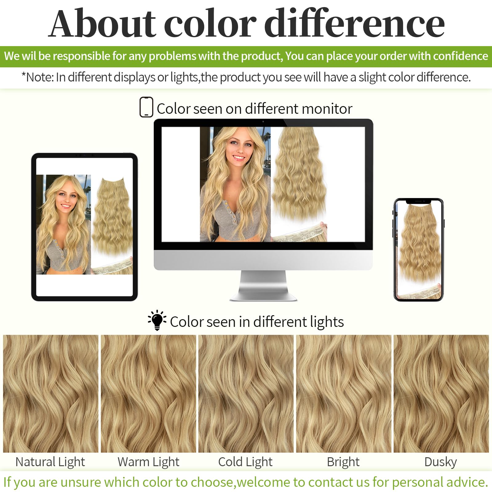 Warm Tips :All pictures are taken by us. Please note that there will be color differences in hair under different lights or monitors. If you are not sure which color to choose, we will be happy to help you match the color.