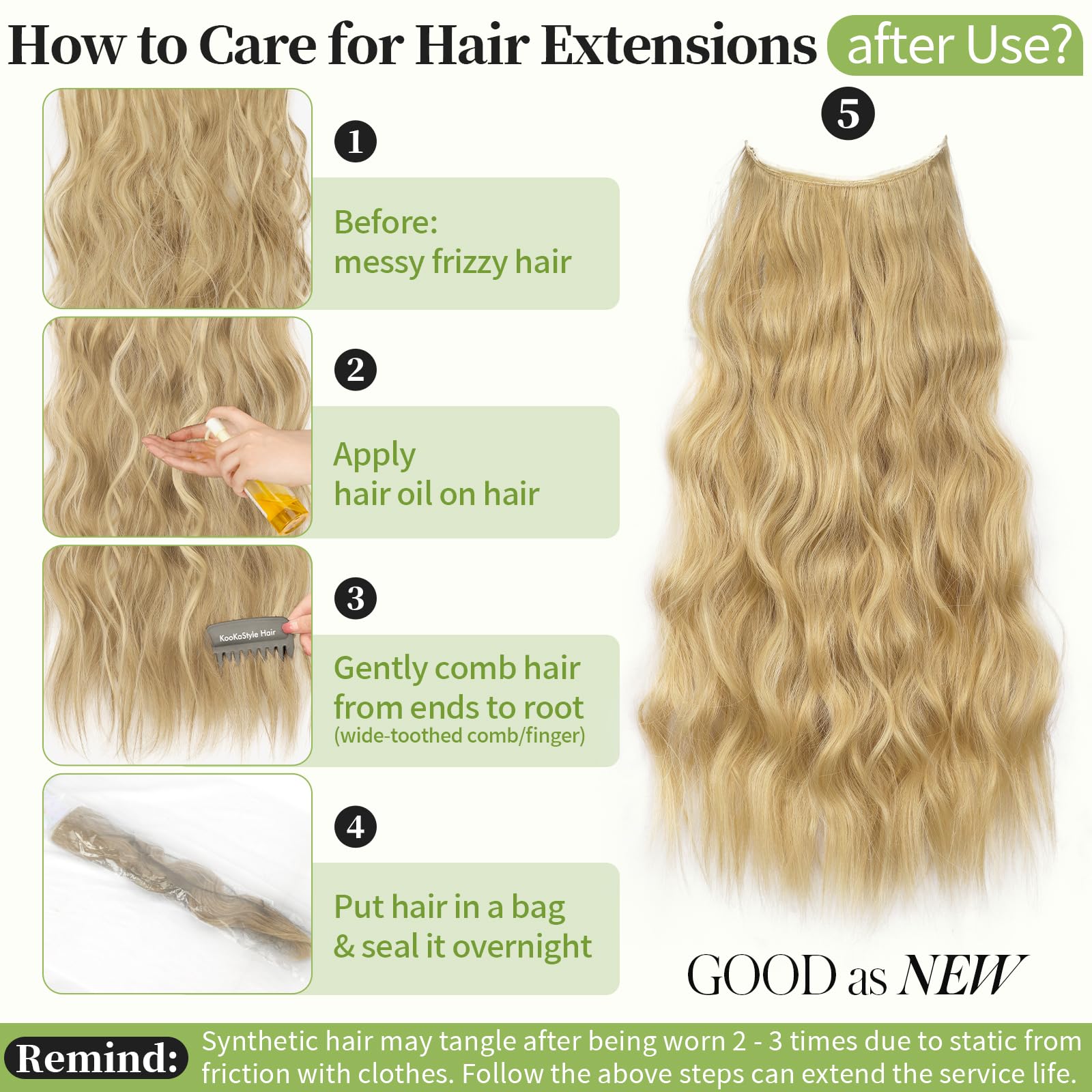 Care Tip: Unlike your own hair, hair extensions can tangle without nutrients. You can use detangle spray or get a spray bottle and put some conditioner in it and add water. If there is no conditioner, just spray some water, it will make the hair extensions not very dry and prevent tangling.
