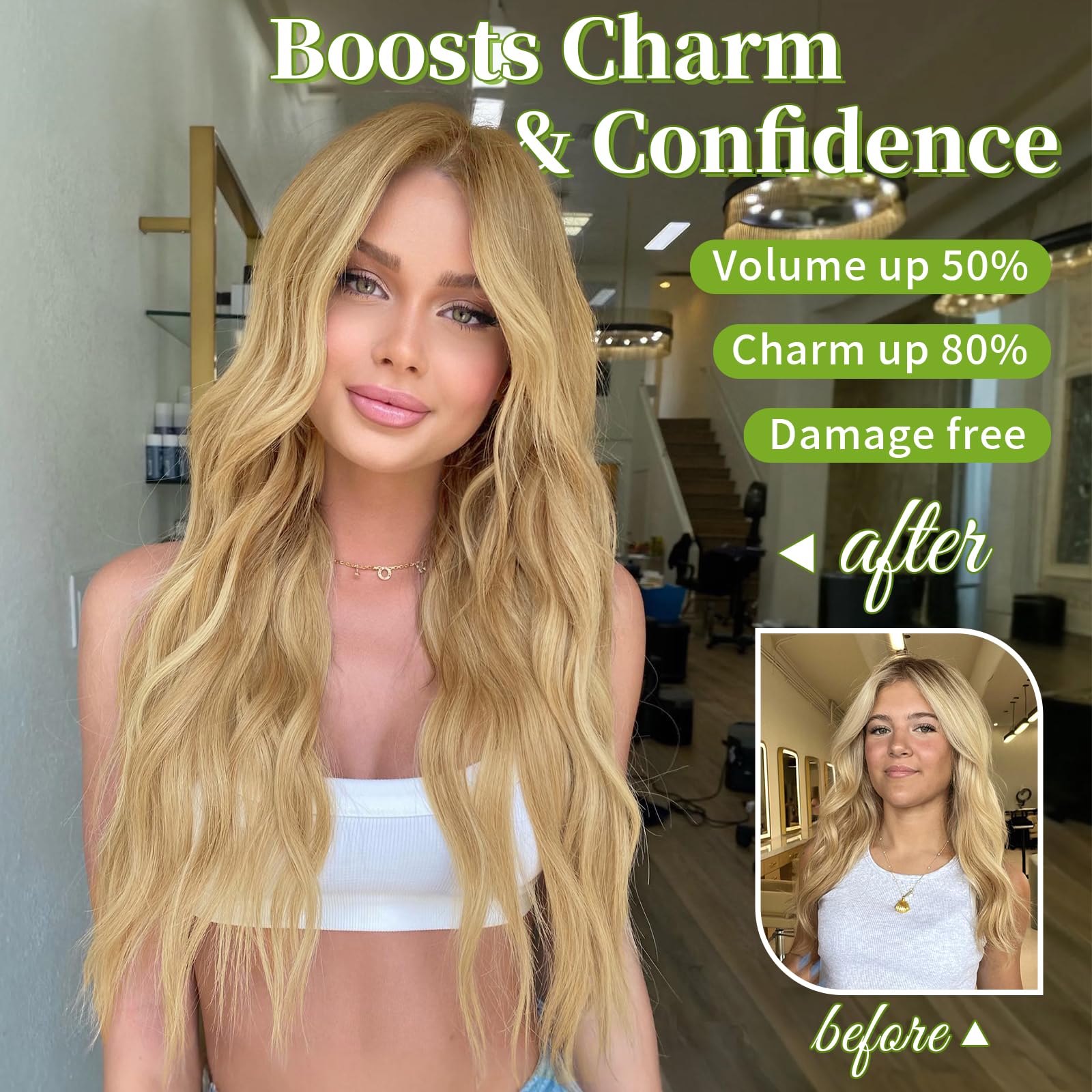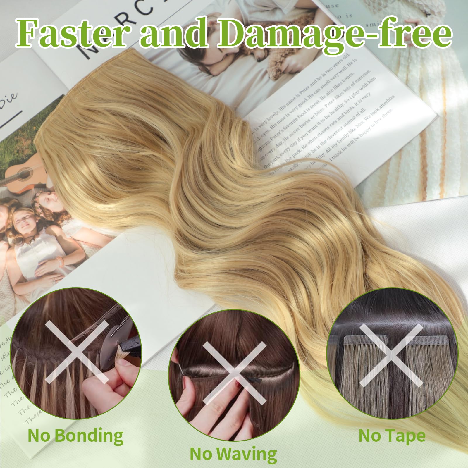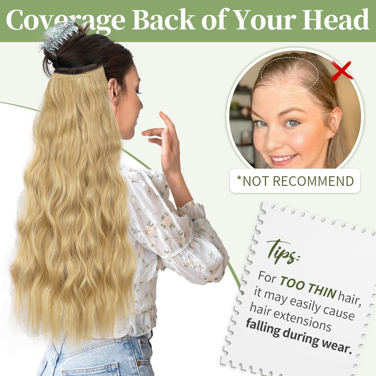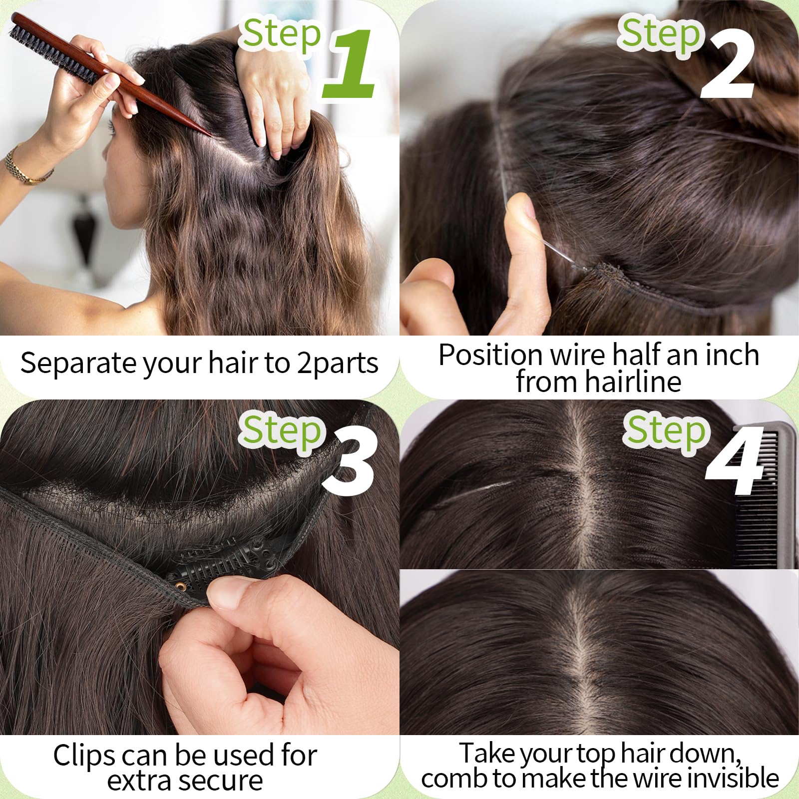 Different ways of wearing: 1. Position the wire hair extensions on your head like a hairdband, secure them with 4 clips, and hide the wires with your own hair.2. Only use invisible wires, suitable for easy hair loss and sensitive to bobby pins customers. 3. Only use 4 hair clips, suitable for customers with soft and sparse hair on the top of the head.It can meet various wearing situations.