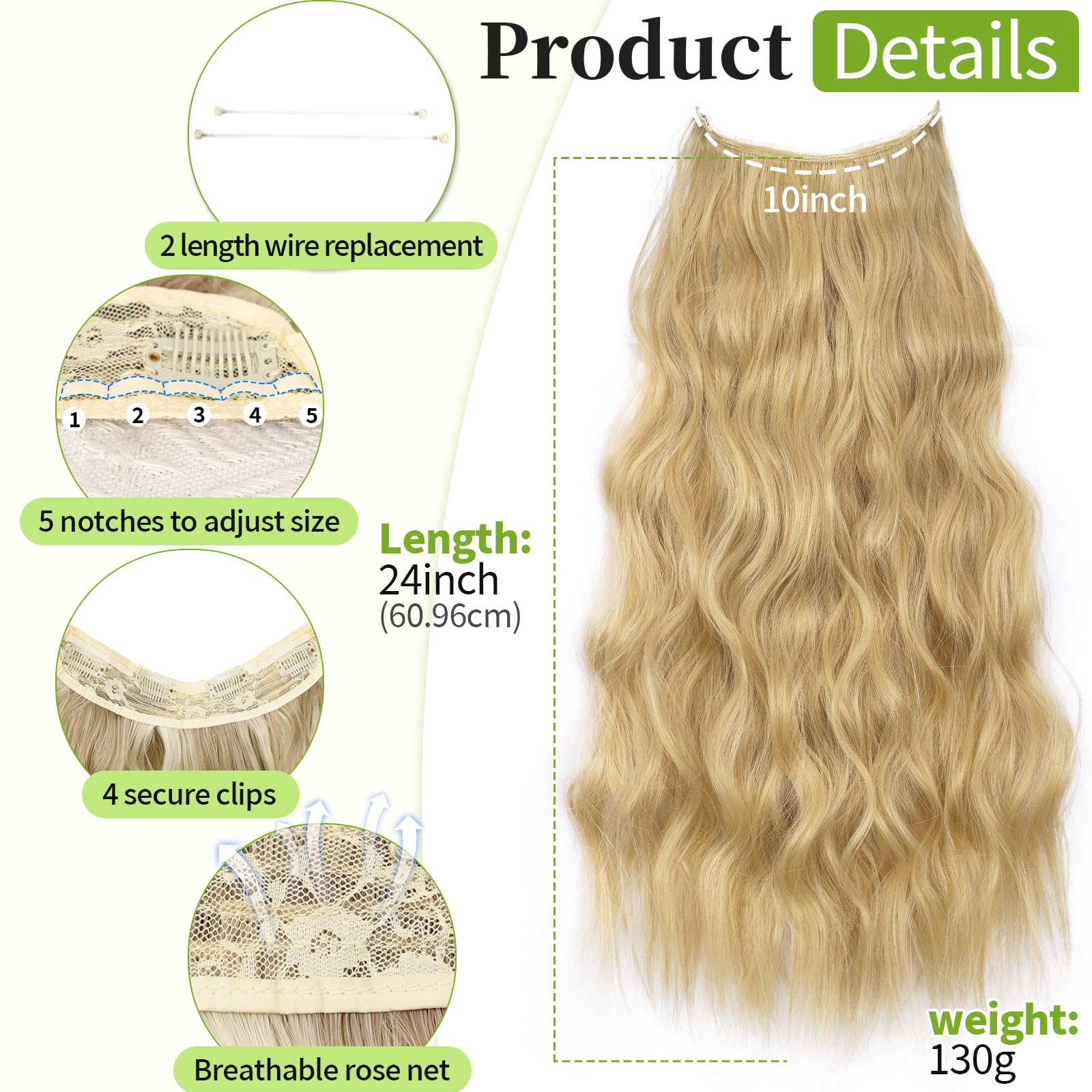 Specifications: Each package includes a hair piece containing 4 clips; 2 different lengths of fishing wire for replacement; You can adjust the suitable size according to your head circumference by putting the hook into the corresponding wire notches. The upgraded wire is thicker and more flexible, not easy to break and will not cause any stress to the scalp.