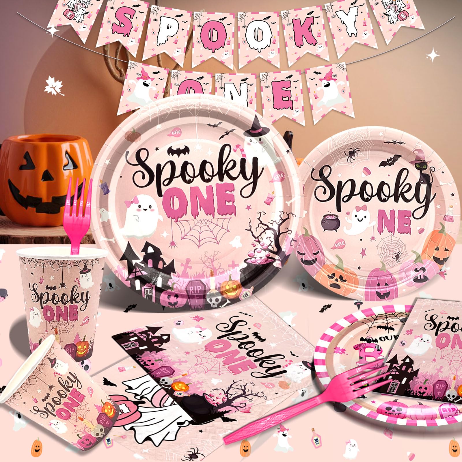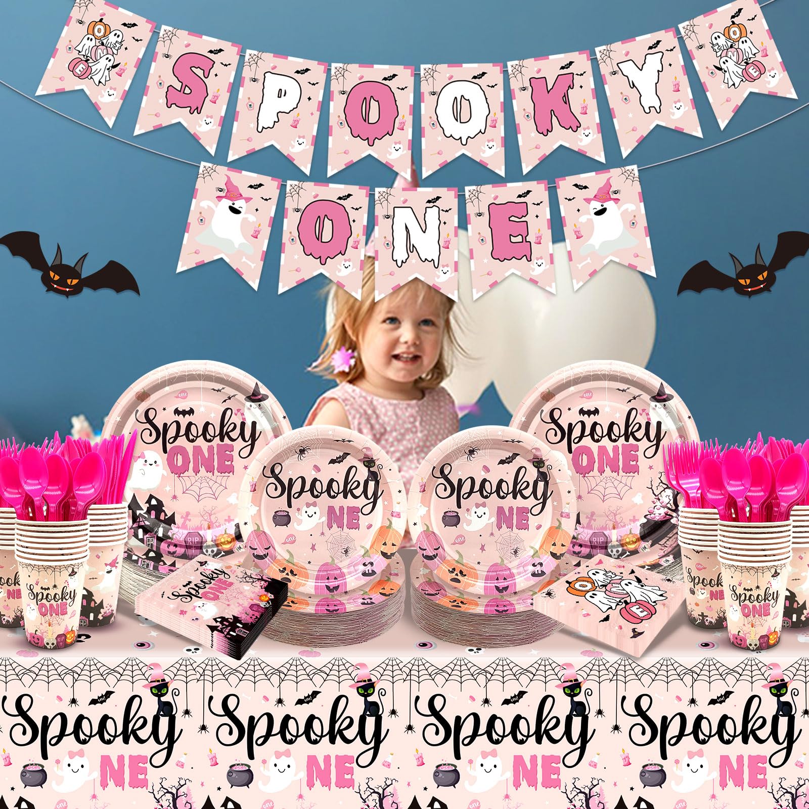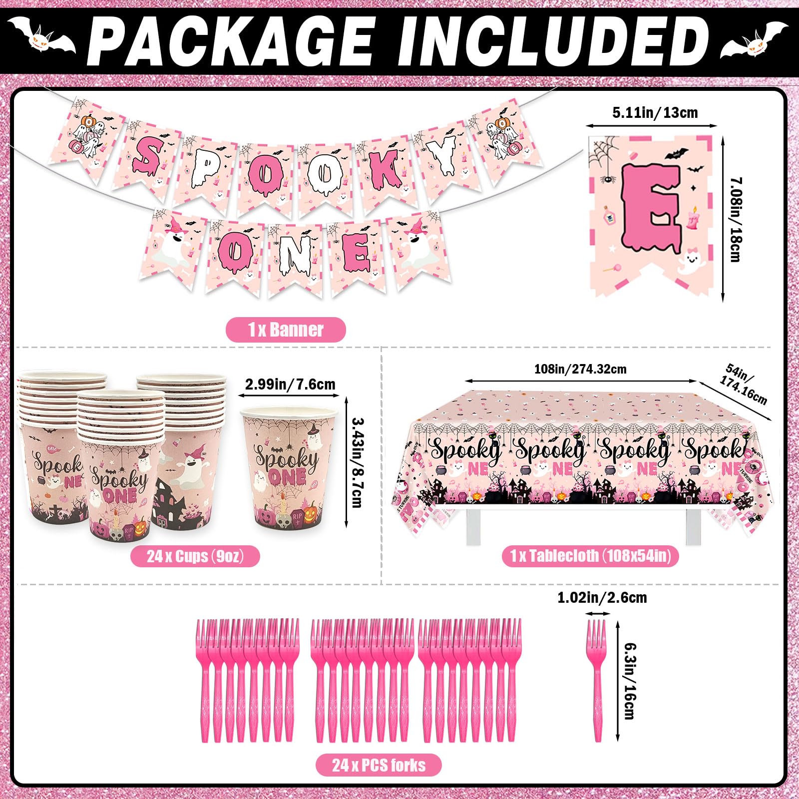 Package included: You will receive 1*"Spooky One" banner, 24*7"Spooky One Birthday paper plates, 24*9"Spooky One Birthday paper plates, 24*Birthday napkins, 72*plastic forks, 24*paper cups, 1*Spooky One Birthday tablecloth.