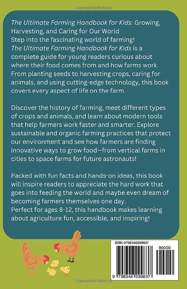 The Ultimate Farming Handbook for Kids: Growing, Harvesting, and Caring for Our World Do your kids wonder where their food comes from? The Ultimate Farming Handbook for Kids is a hands-on guide for young readers (ages 8-12) eager to learn about life on the farm and how agriculture impacts our daily lives. Filled with engaging information and real-world insights, this book covers everything from crops to livestock and explores how farmers work with nature to produce the food we eat. Inside this book, young readers will discover: A variety of crops: Learn about corn, wheat, soybeans, hay, and more. Each crop has its own chapter, explaining how itβs grown, harvested, and used in everyday products. Essential livestock: Meet the animals raised on farms, like dairy cows, beef cattle, chickens, turkeys, and pigs. Each animal chapter dives into their care, diet, and the valuable products they provide. Modern tools and technology: Explore how farmers use tools from basic hand implements to high-tech machines like drones, GPS, soil sensors, and more. Discover how technology is transforming farming to be more efficient and precise. Sustainable and organic farming: Understand how farmers conserve water, protect soil health, reduce chemicals, and support biodiversity. See how organic farming techniques work to grow food responsibly. Innovations for the future: Take a peek into the future of farming, with chapters on vertical farms, aquaponics, desert farming, and even farming in space! Highlights of what kids will learn: From soil health to crop rotation, from robotic milking machines to the world of vertical farms, The Ultimate Farming Handbook for Kids brings farming to life in a way thatβs clear, exciting, and accessible for young minds. This book explains both the βhowβ and βwhyβ behind farming practices, making complex ideas like carbon sequestration, regenerative agriculture, and animal welfare easy to understand. With insights into the daily lives of farmers and real examples of how they grow food sustainably, this guide provides a well-rounded view of the agricultural world. The Ultimate Farming Handbook for Kids is a must-read for any child interested in nature, animals, food, and the environment. Perfect for readers who love hands-on learning, this book is an inspiring and educational journey through the farm thatβs sure to spark curiosity and respect for the hard work of farmers everywhere.
