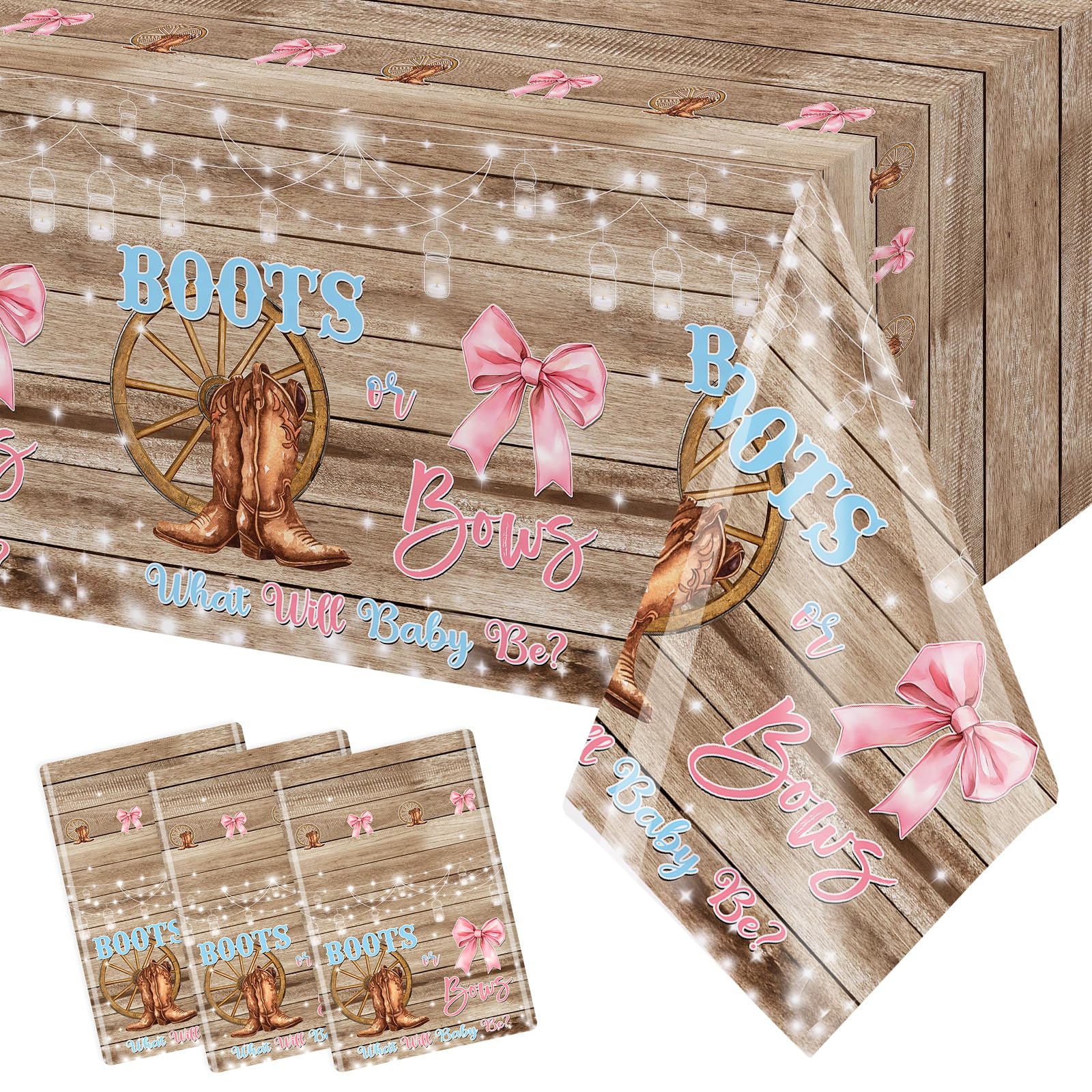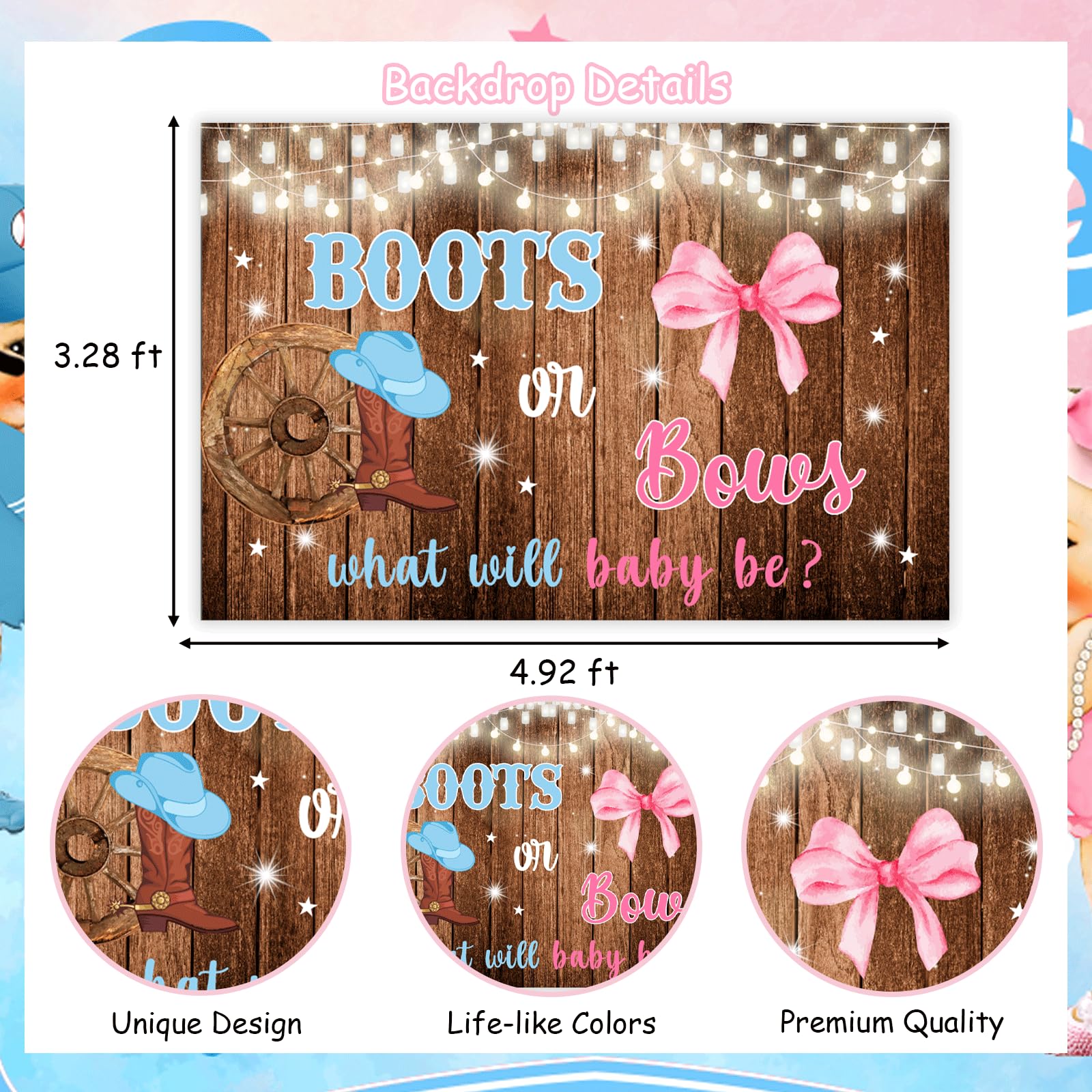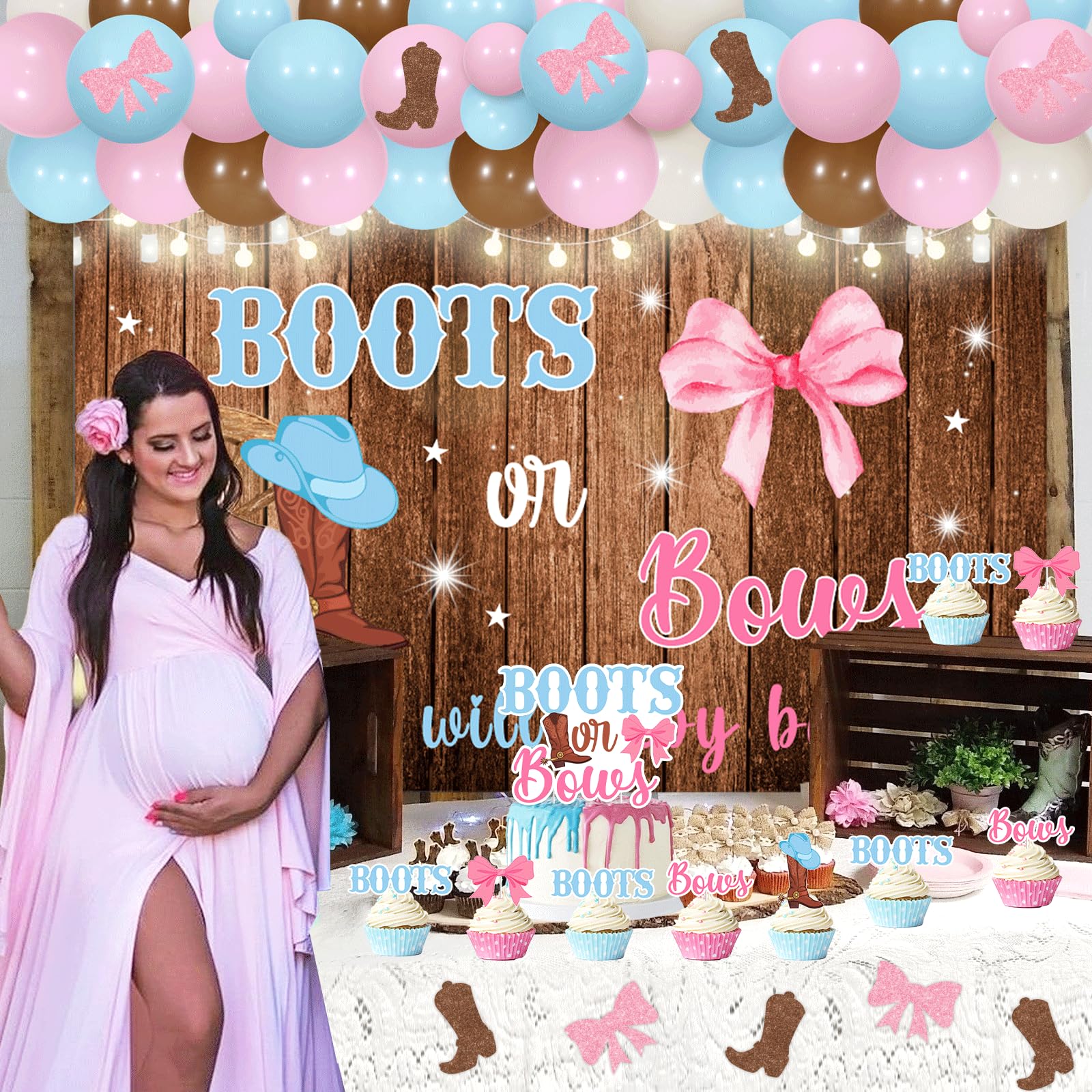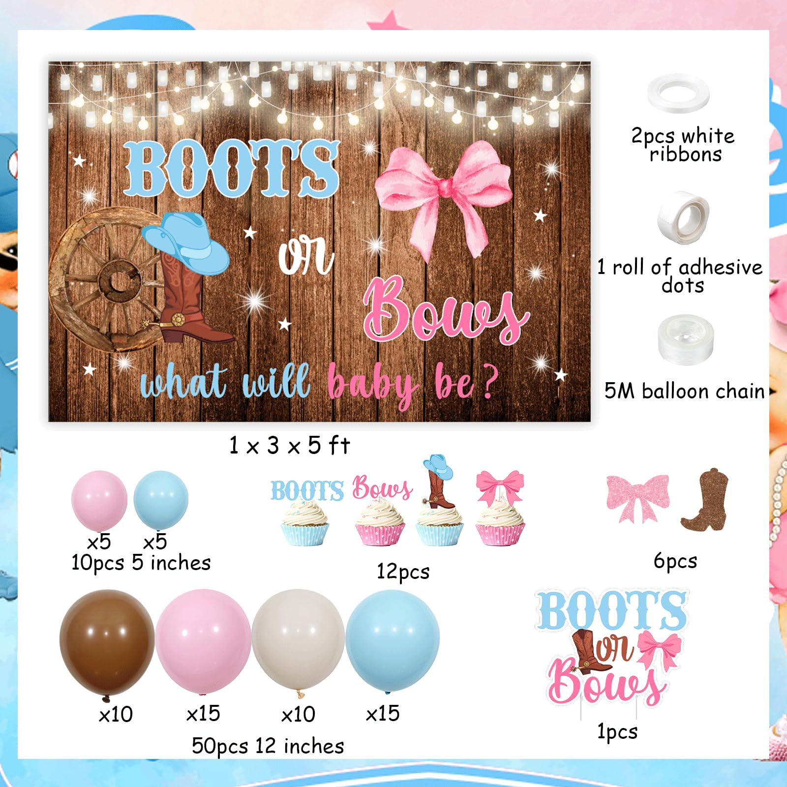 Package Includes: The boots or bows gender reveal decorations include 50 x latex balloons 12 inches, 10 x latex balloons 5 inches, 1 x boots or bows backdrop 3 x 5 ft, 1pcs boots or bows cake topper, 12pcs boots or bows cupcake toppers, 6pcs boots or bows stickers