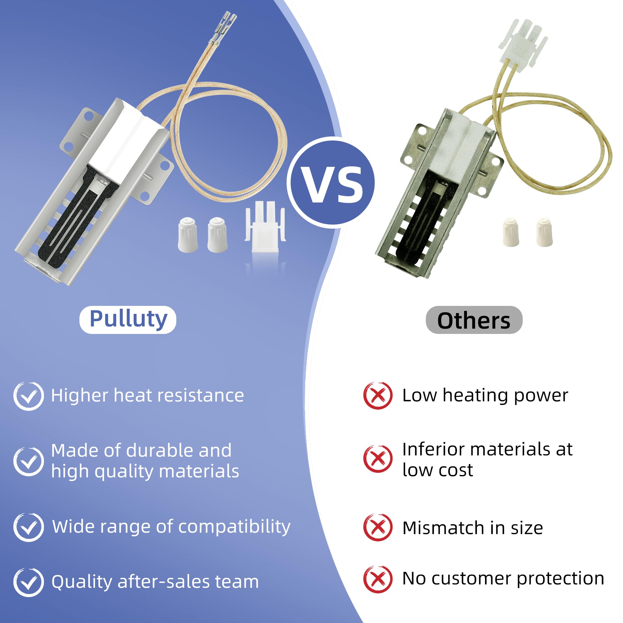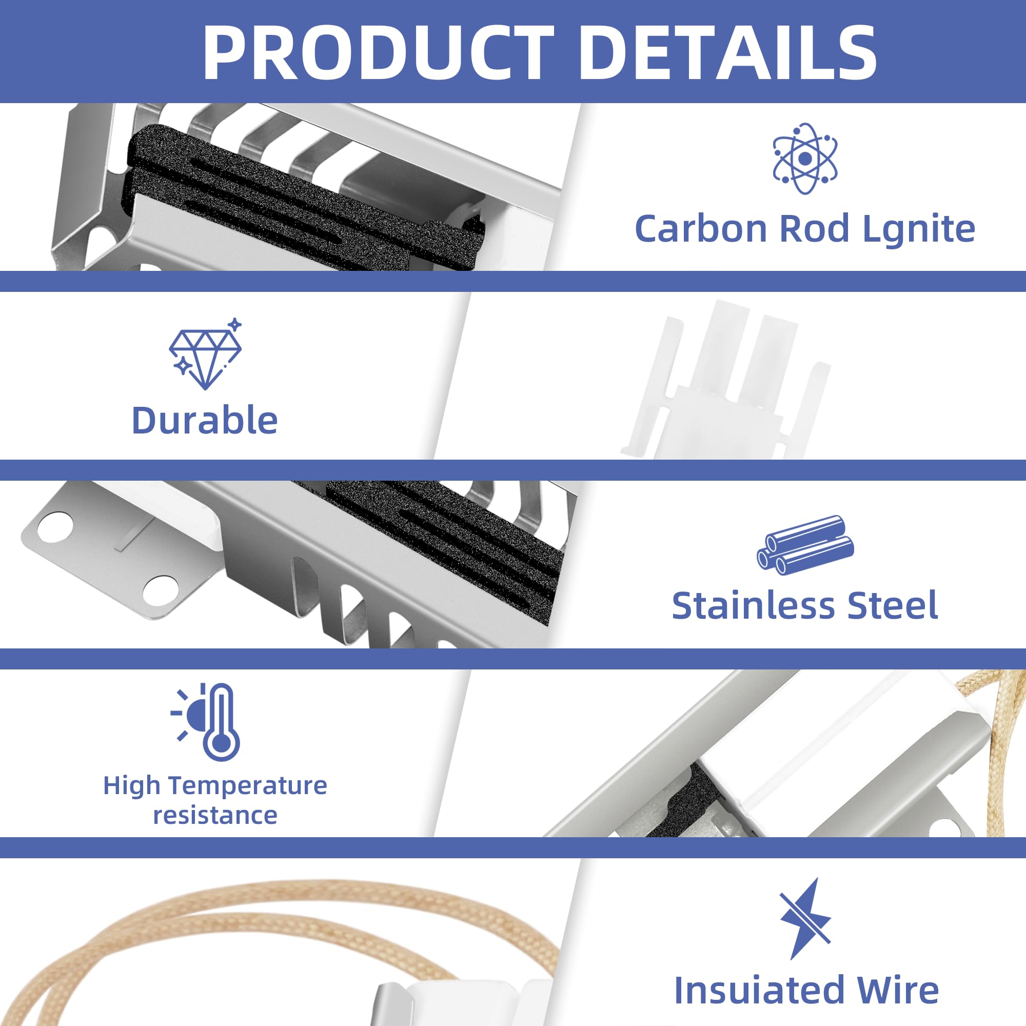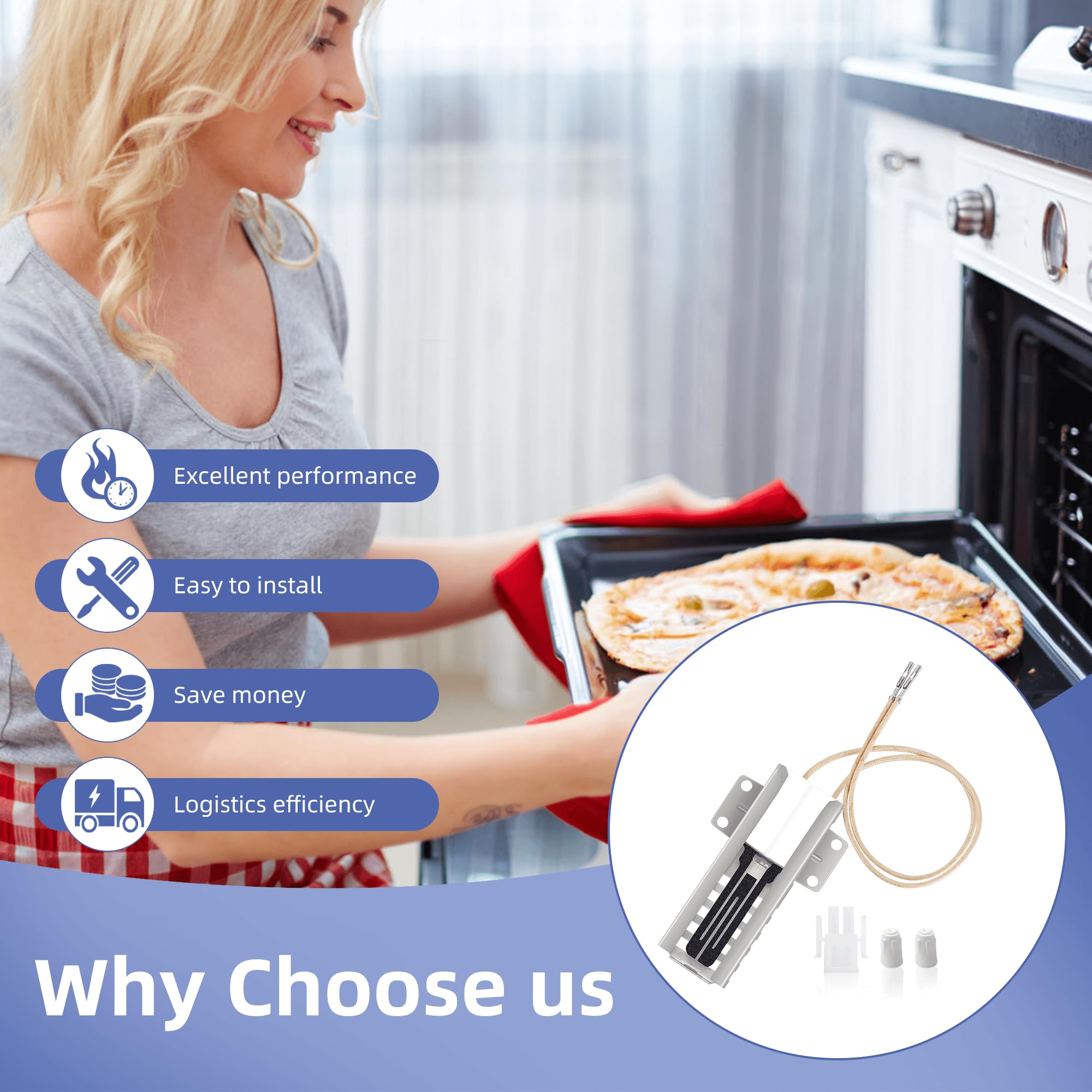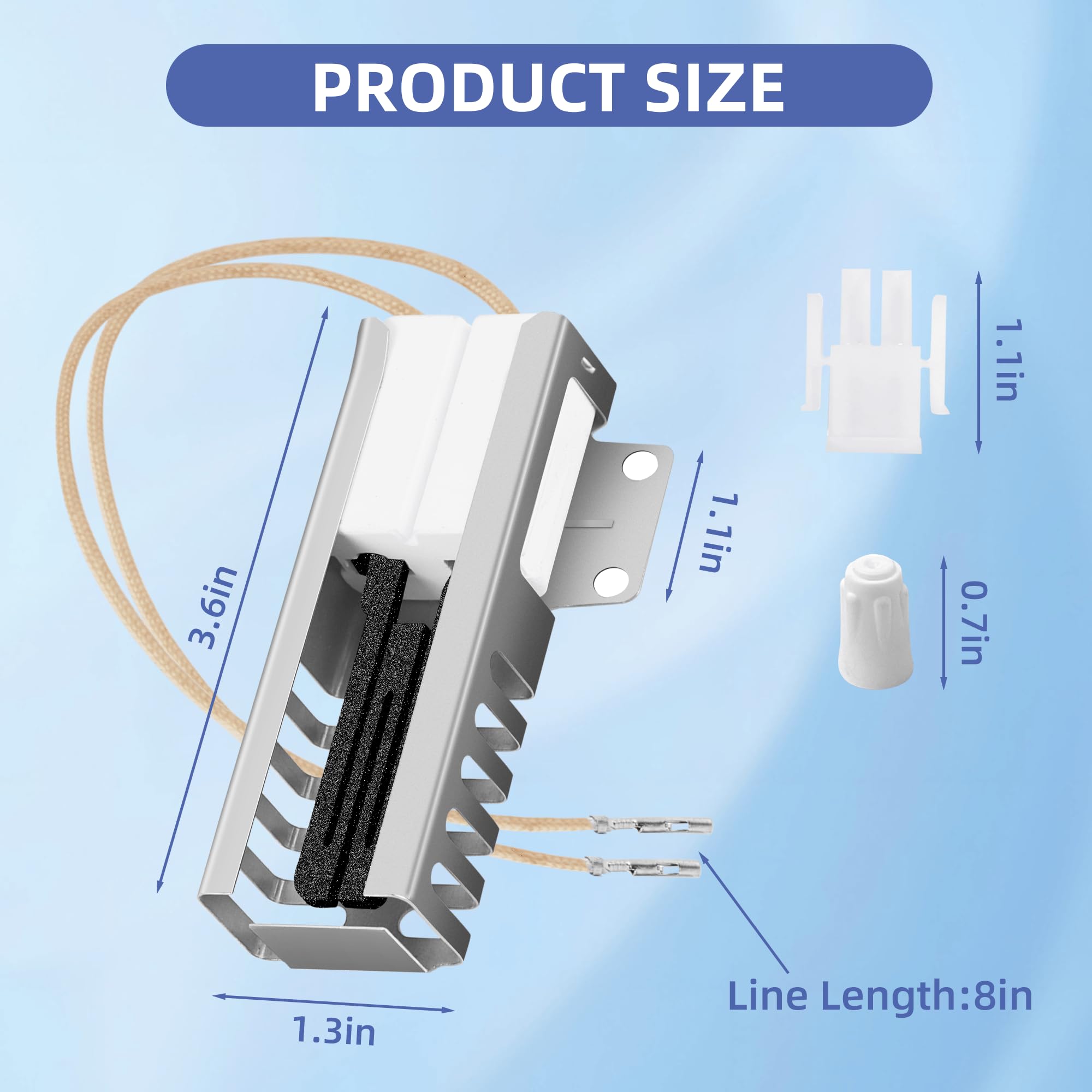 Oven igniter for gas stove. Each igniter is made of high-quality materials and undergoes a series of process tests, including an anti-aging test. The igniter can quickly reach a temperature of 2000-2800F in just 1 minute.It is normal for the igniter to discolor over time(contains fragile material silicon carbide. If the product is damaged upon receipt (which is very unlikely), it is most likely caused during transportation.Please contact us immediately).