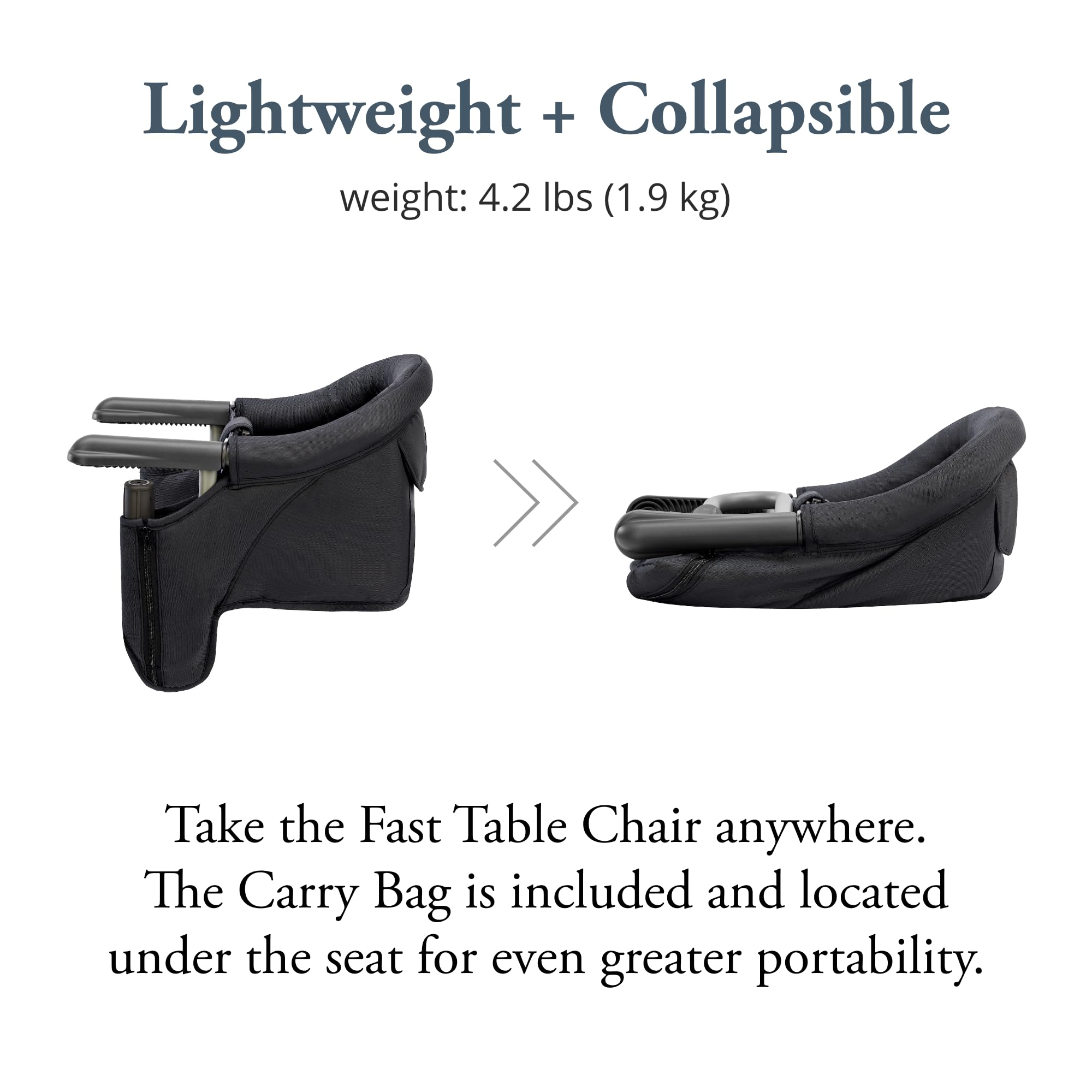 CONVENIENT STORAGE & ACCESSORIES: Features a rear storage pocket for baby items, a washable cover, and a built-in carry bag for easy transport. Add the optional food catcher tray with a cup holder for a tidy feeding experience, available separately.