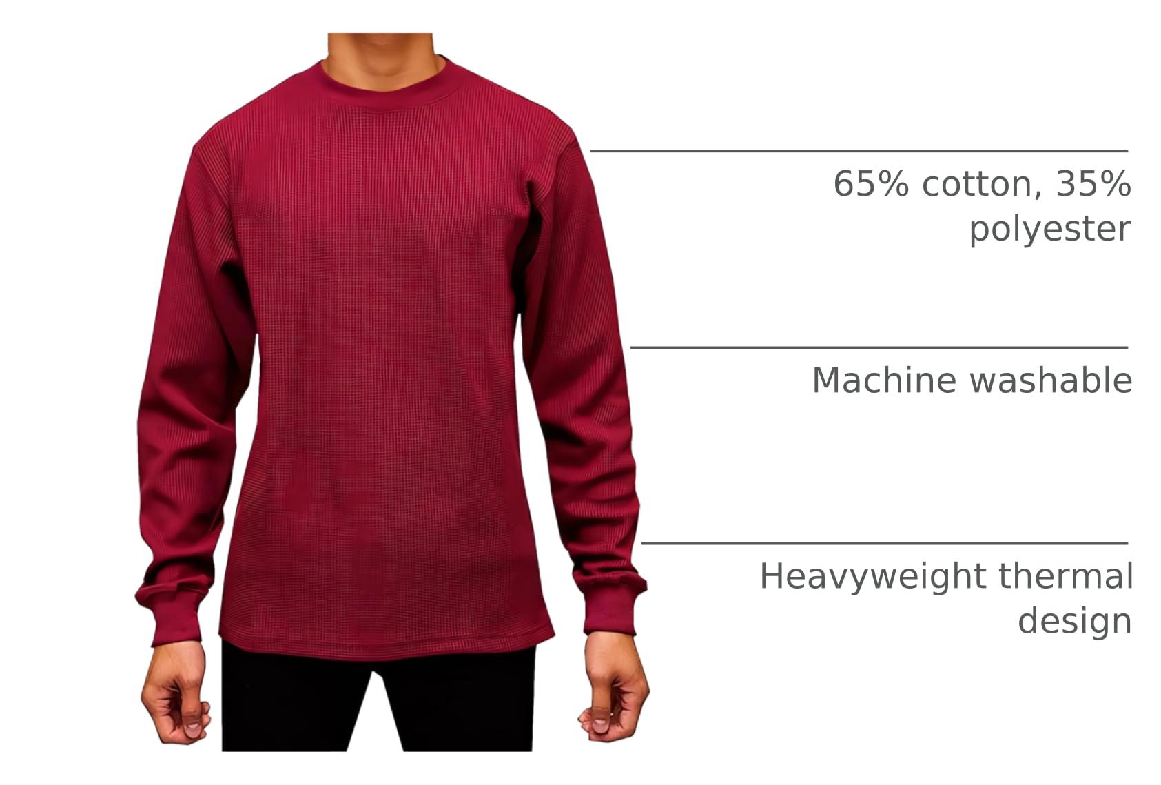 Description Stay warm, comfortable, and stylish with the Access Men's Thermals Heavyweight Long Sleeve Thermal Crew Neck Top—the perfect blend of durability, functionality, and all-day comfort. Crafted from rugged, heavy-duty waffle knit fabric, this waffle thermal long sleeve men is built to endure cold temperatures while maintaining breathability and flexibility. The high-quality construction ensures long-lasting wear, making it an essential addition to your fall and winter wardrobe. Designed for superior insulation, the ribbed collar and snug wrist cuffs help seal in warmth while blocking out chilly air. The slightly elongated sleeves ensure a secure fit, preventing them from riding up and accommodating various arm lengths. Whether you're layering for extra warmth or wearing it solo, these mens long sleeve thermal shirts offer an ideal fit without feeling bulky or restrictive. Made from shrink-resistant fabric with a subtle stretch, our mens thermal tops long sleeve retains its shape and softness even after multiple washes. Its versatile design makes it perfect for outdoor activities like hiking, camping, or tailgating, as well as for lounging at home. Pair this mens waffle thermal long sleeve shirt with jeans for a casual look or layer it under a jacket for added warmth in extreme cold. Whether you’re braving the elements or relaxing indoors, the Access Men's thermal waffle shirts for men deliver reliable warmth, durability, and everyday comfort—making it a must-have for any cold-weather wardrobe.