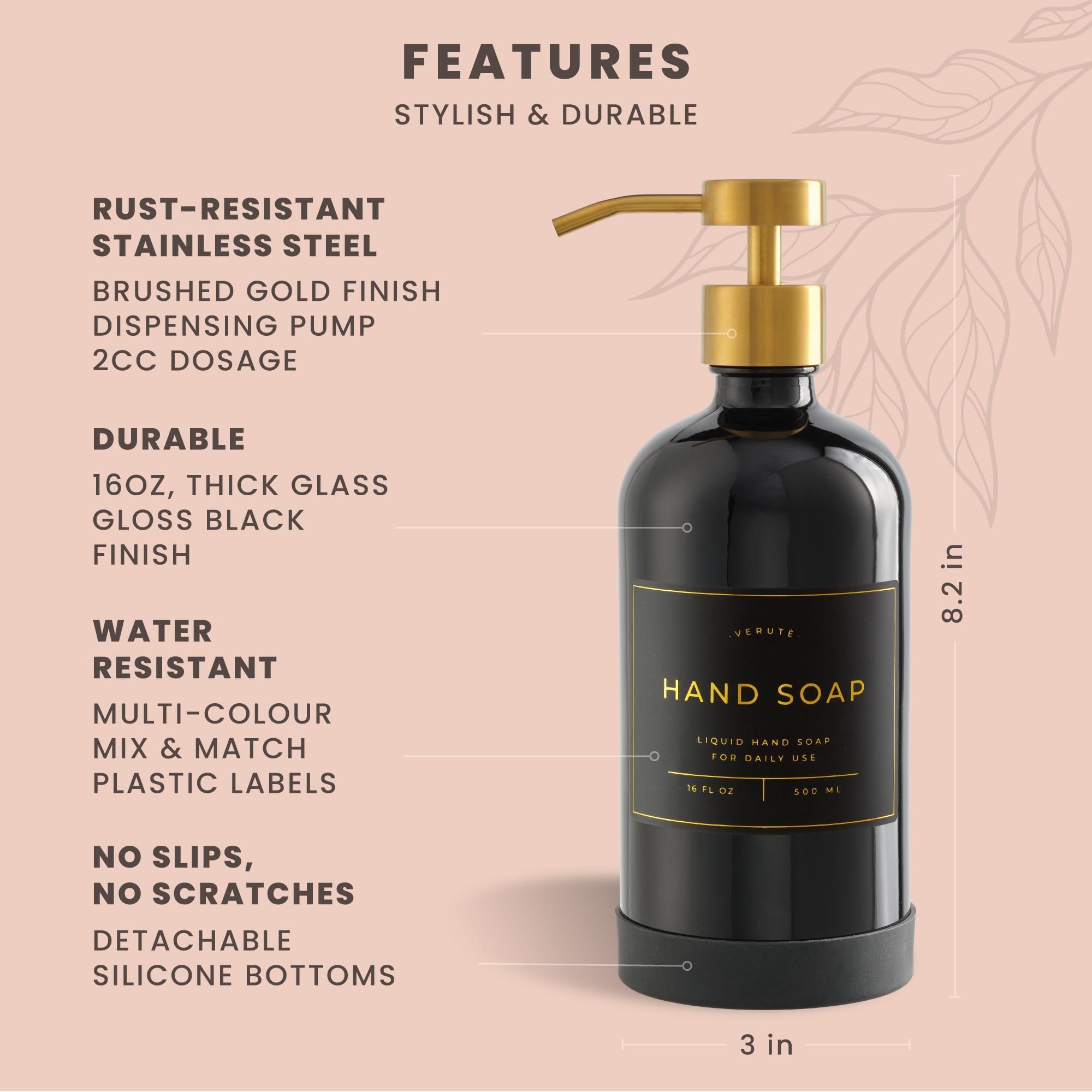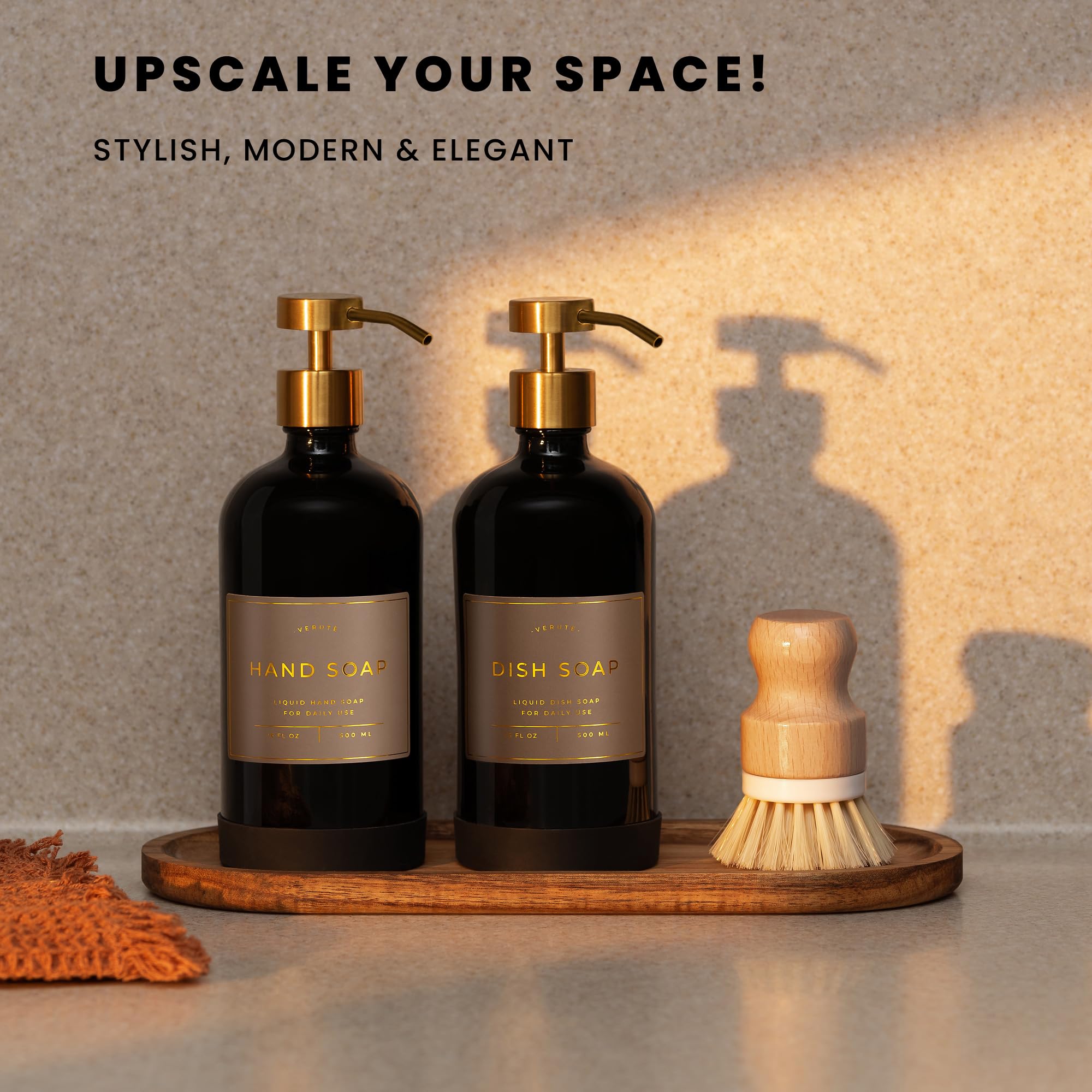 DISPENSING MADE EASY - Fill these kitchen sink bottles with your products and dispense them with one press. Our containers have a brushed gold stainless steel pump that allows liquid to flow smoothly.