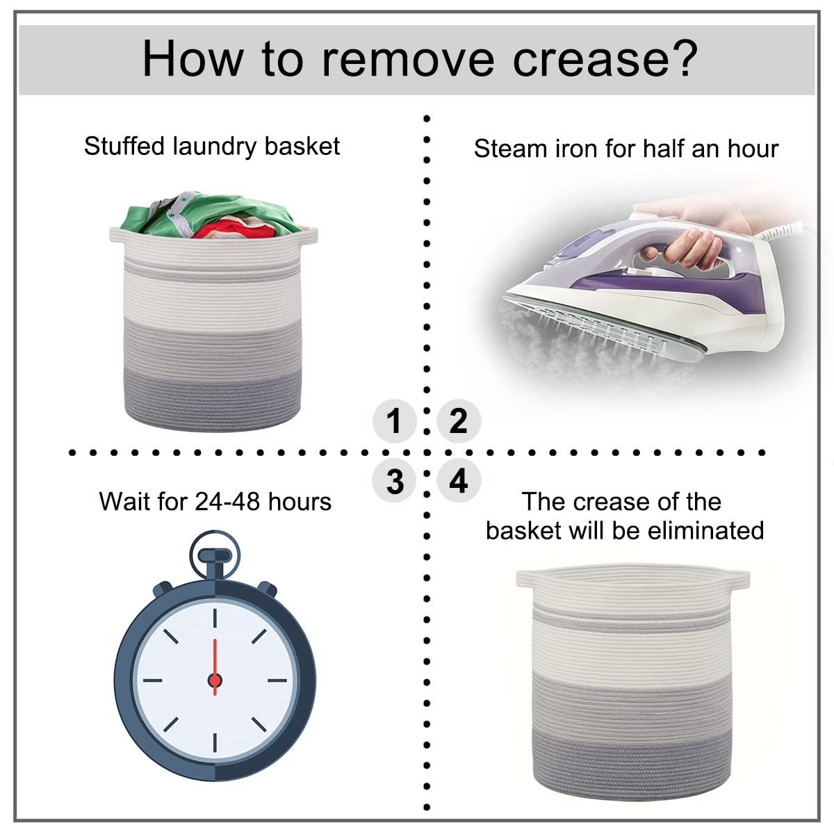Washable Large Basket: This large basket can be washed by hand or machine with gentle detergent. If machine washed, please put them into a laundry bag. NOTE: These cotton rope baskets are folded when shipping, but it will turn back to its elegant shape quickly if you fill it with some towels or clothing, and iron is great idea to remove the creases