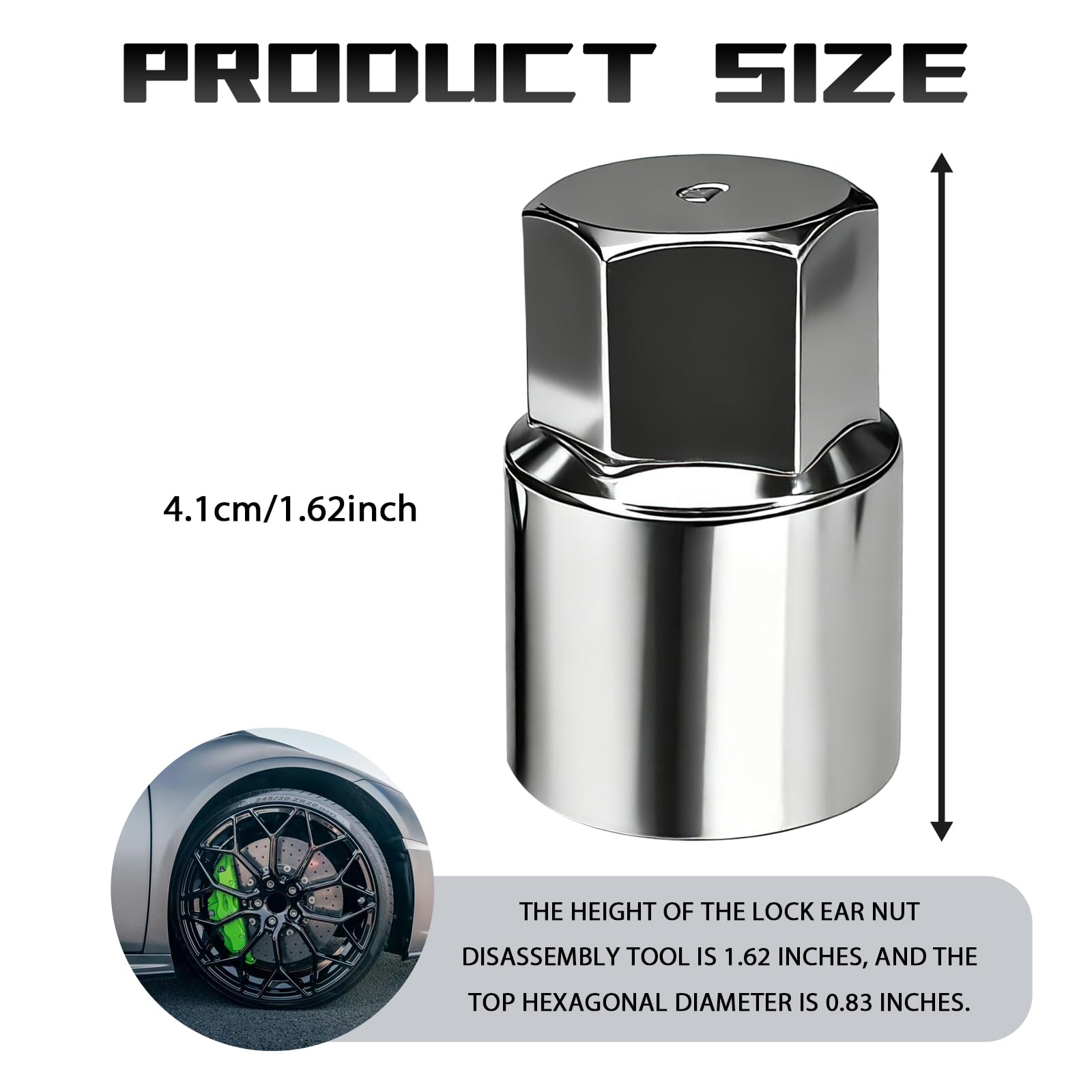 Product Specifications: Our lug nut key has a top hexagonal diameter of 0.83 inches, a bottom outer diameter of 1.07 inches, an inner diameter of 0.82 inches, and a height of 1.58 inches. Please carefully check the dimensions before purchasing