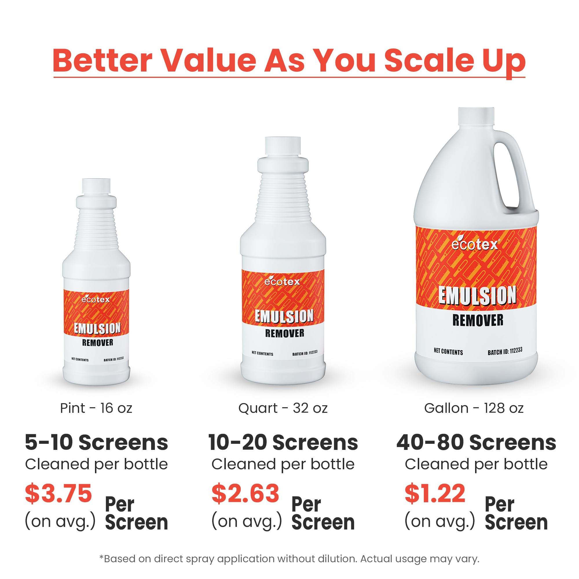 Safe for All Mesh - No matter your what emulsion came in your screen printing starter kit or how dirty your silkscreen equipment is, Ecotex's Emulsion Remover can clean it without any harsh chemicals.