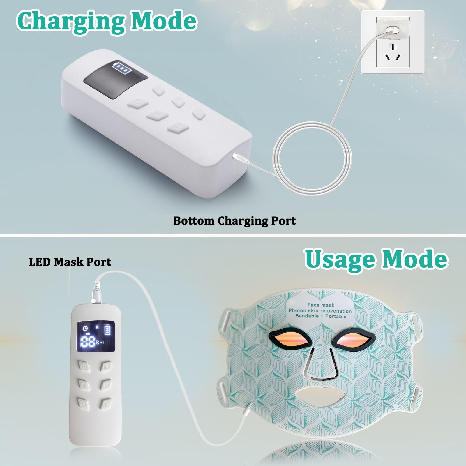 【Portable Skin Care & Save Time and Money】Our flexible silicone LED mask allows you to say goodbye to expensive SPA facials, Easily enjoy safe, effective, painless, and side-effect-free salon grade skin care at home. The LED face mask can be used countless times, saving you a lot of money and time. The foldable and portable rechargeable design allows you to keep your skin young at any time, whether at home, at work or traveling