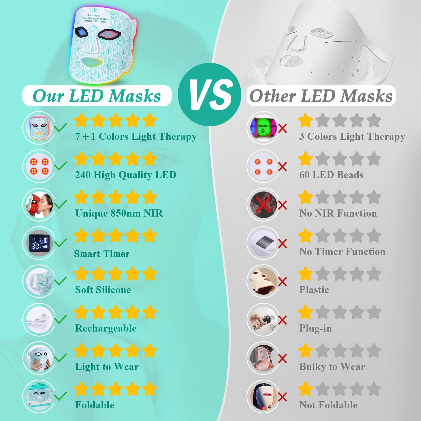 【7 +1 Colors Light Therapy Mask】The LED face mask light therapy possession 7 colors light with 850nm near-infrared, different wavelengths of light suitable for different types of skin, repair and solve various skin problems. Individually controlled 850nm near-infrared light and 7 colors light form multiple light waves that effectively penetrate deep into the skin cells, reshape skin vitality from the inside out, and improve skin condition