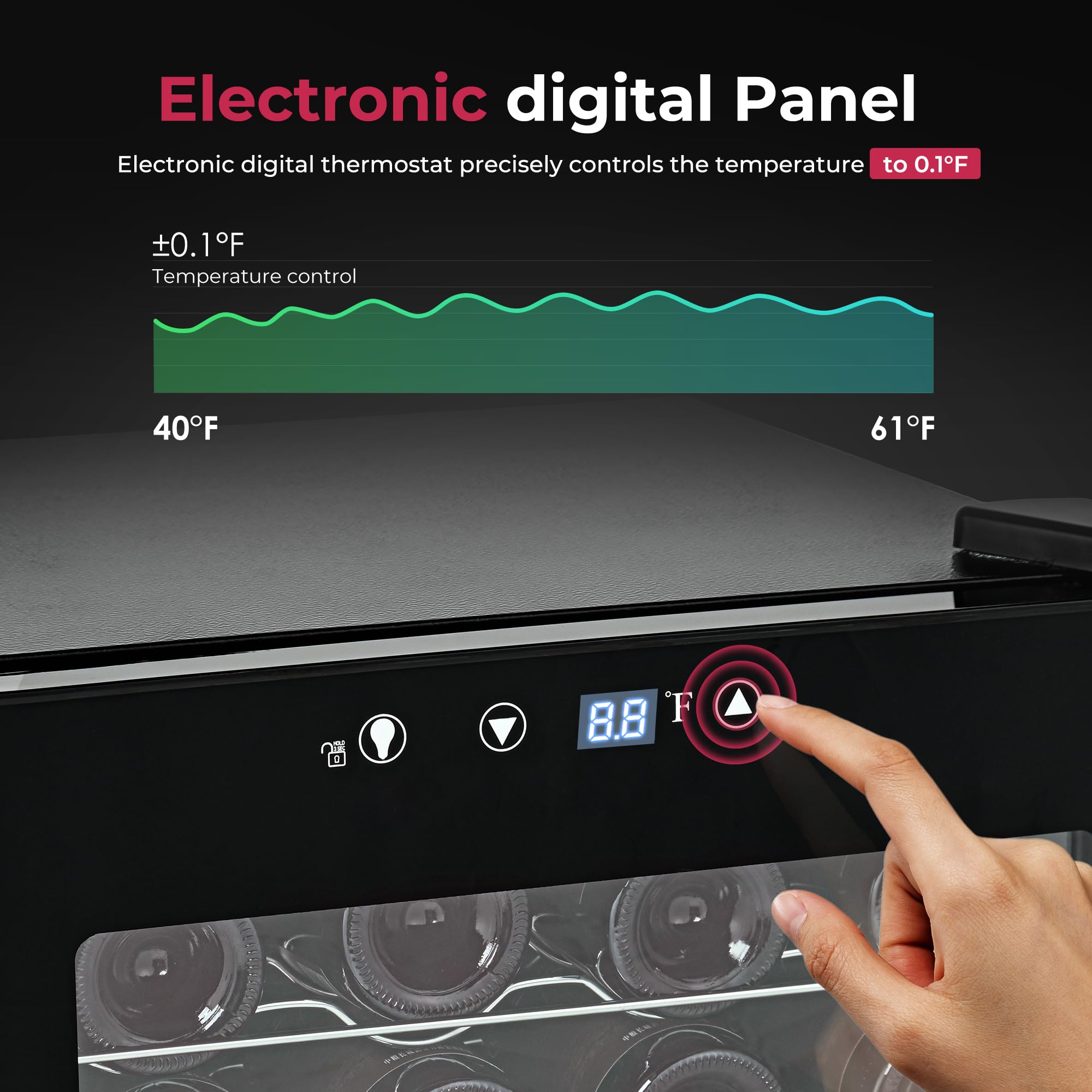 One-Touch Temperature Control: Keep your wine at its best with a temperature range of 40°F to 61°F and optimal humidity levels. The user-friendly touch panel with a digital display allows you to set the perfect temperature for each type of wine, ensuring they’re always ready to enjoy