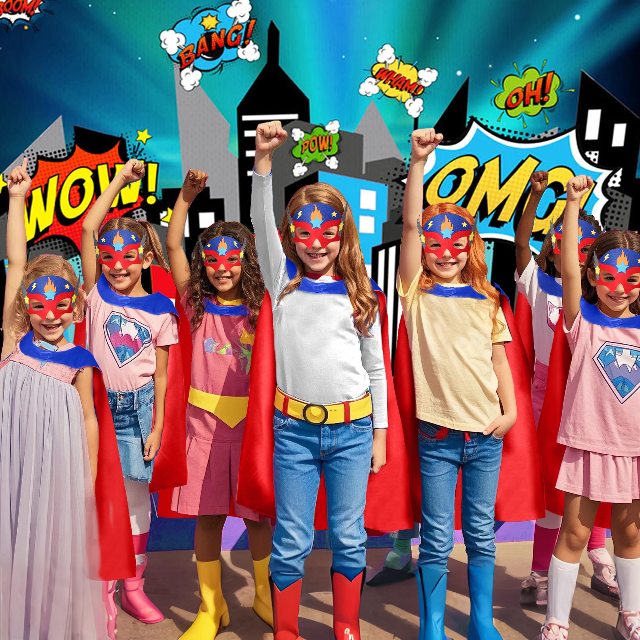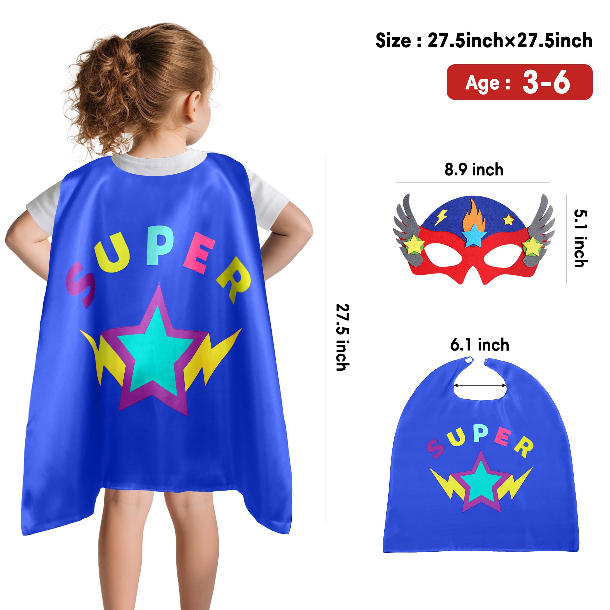 Convenient Sized: Super Hero Capes for kids, 27.5 inch L x 27.5 inch W, recommended for 3-9 years old children; you can adjust the neckline with adjustable buckles to make Dress-Up Cape suit neck well. Star Superhero Mask can extremely fit with flat elastic strap, soft wearing
