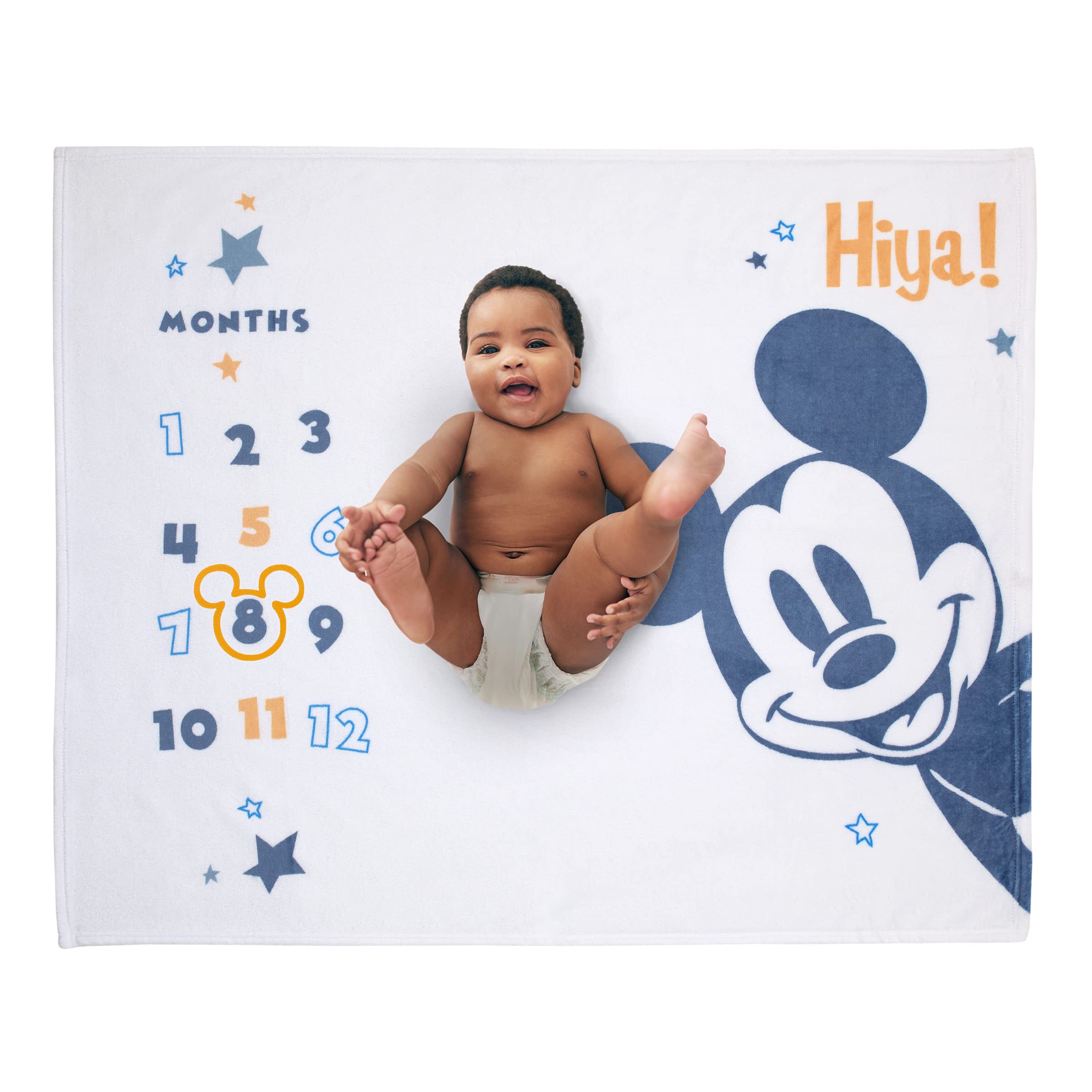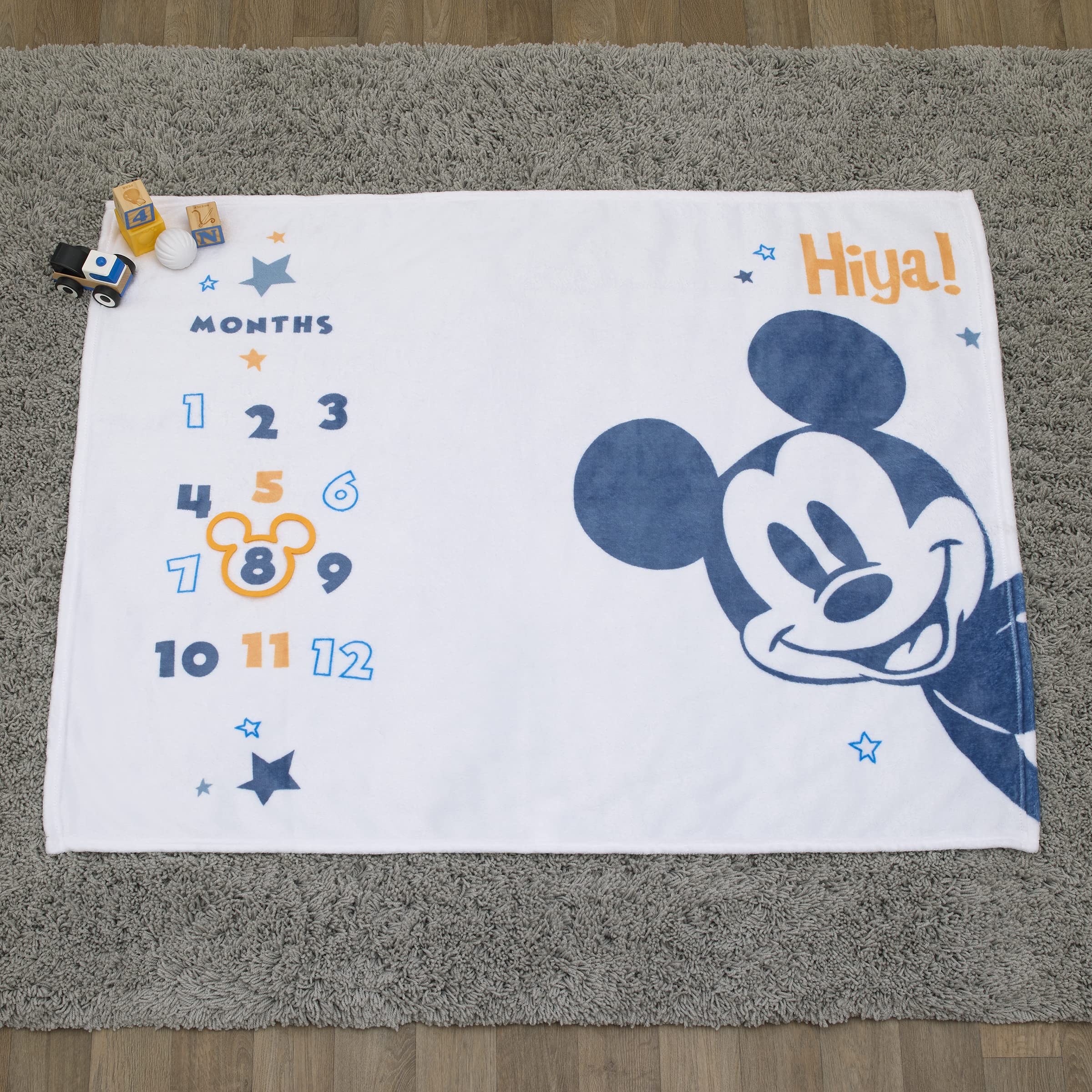 Designed to create the perfect photo opportunity and capture milestones for each month. Document baby's progress as they grow. Includes a Mickey head shaped felt cutout to place on each month. This blanket is made of soft plush fabrics and measures 40" x 50". Features classic Mickey Mouse with saying, "Hiya!".