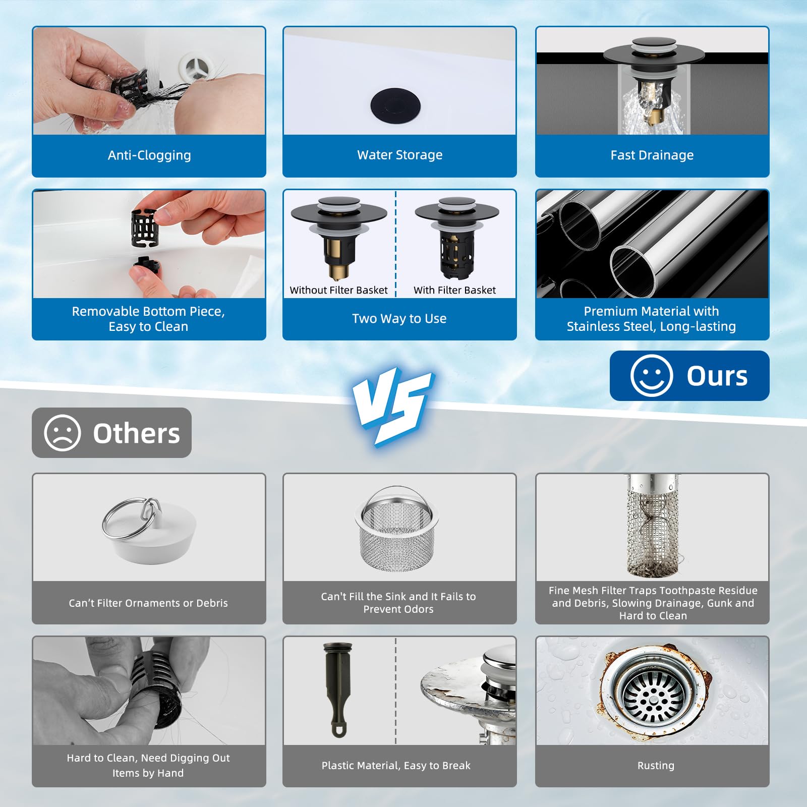 [Easy to Clean] Cleaning is just as easy. The dual-layer removable basket can be easily removed by simply twisting, allowing you to thoroughly clean all components of the drain stopper. Additionally, the basket's detachable bottom design surpasses similar non-removable options, making cleaning more comprehensive and preventing the awkwardness and inconvenience of digging out items by hand. To ensure compatibility, please remember to measure your bathroom sink drain opening diameter before purchasing to confirm a proper fit