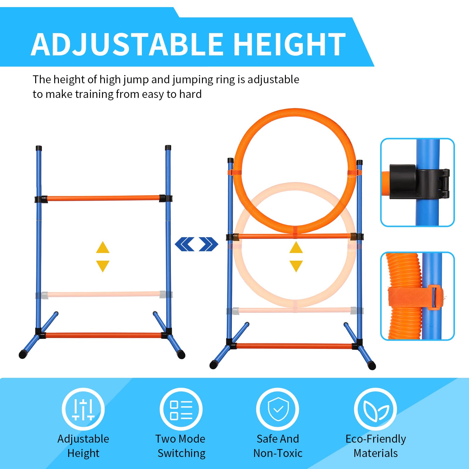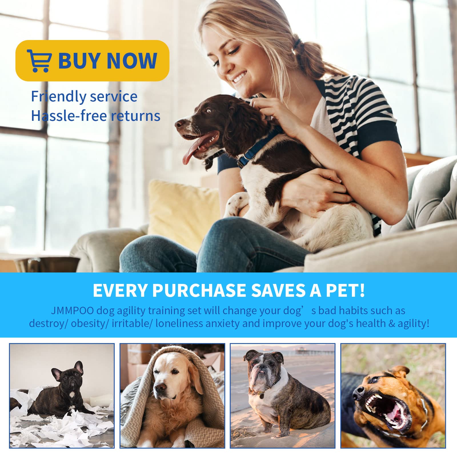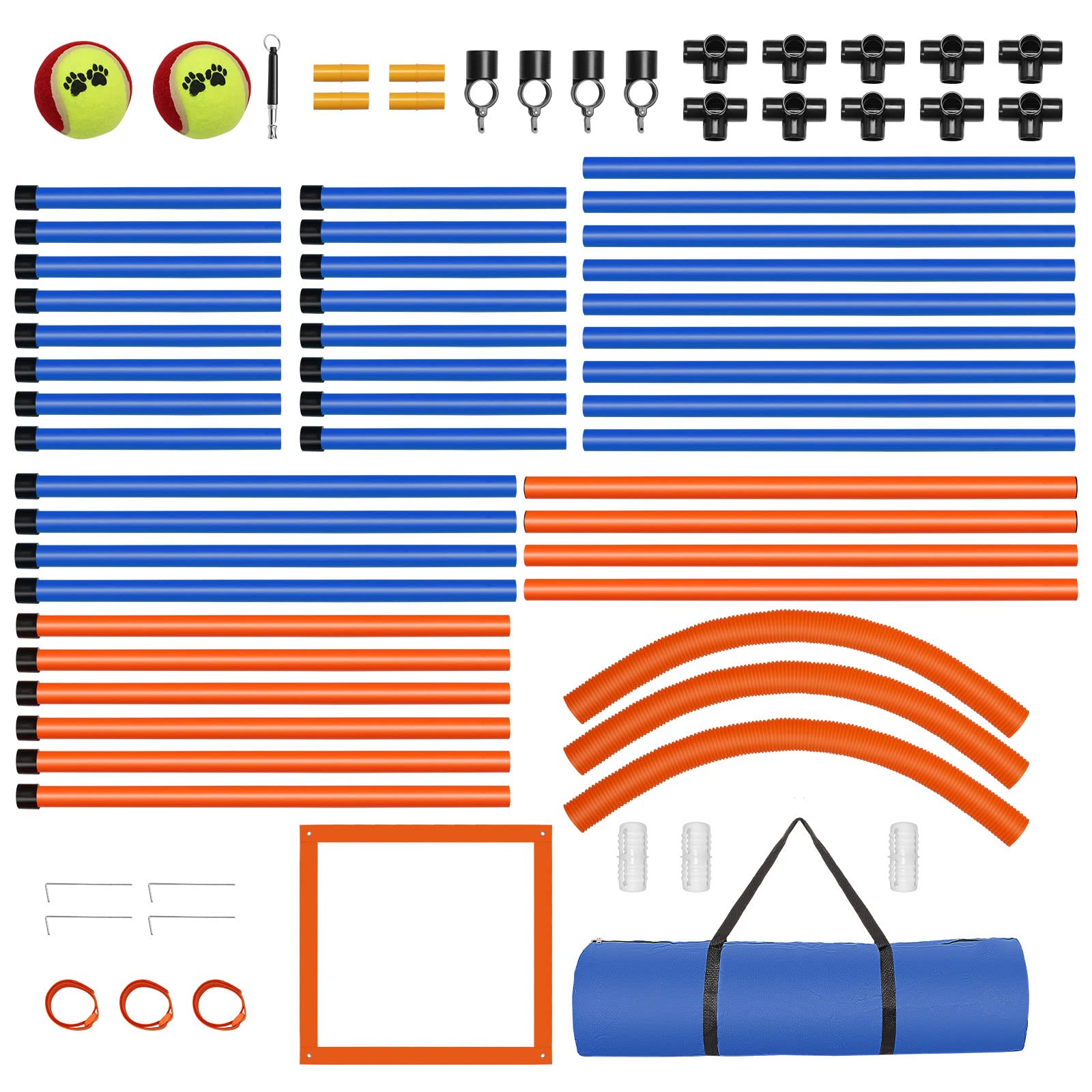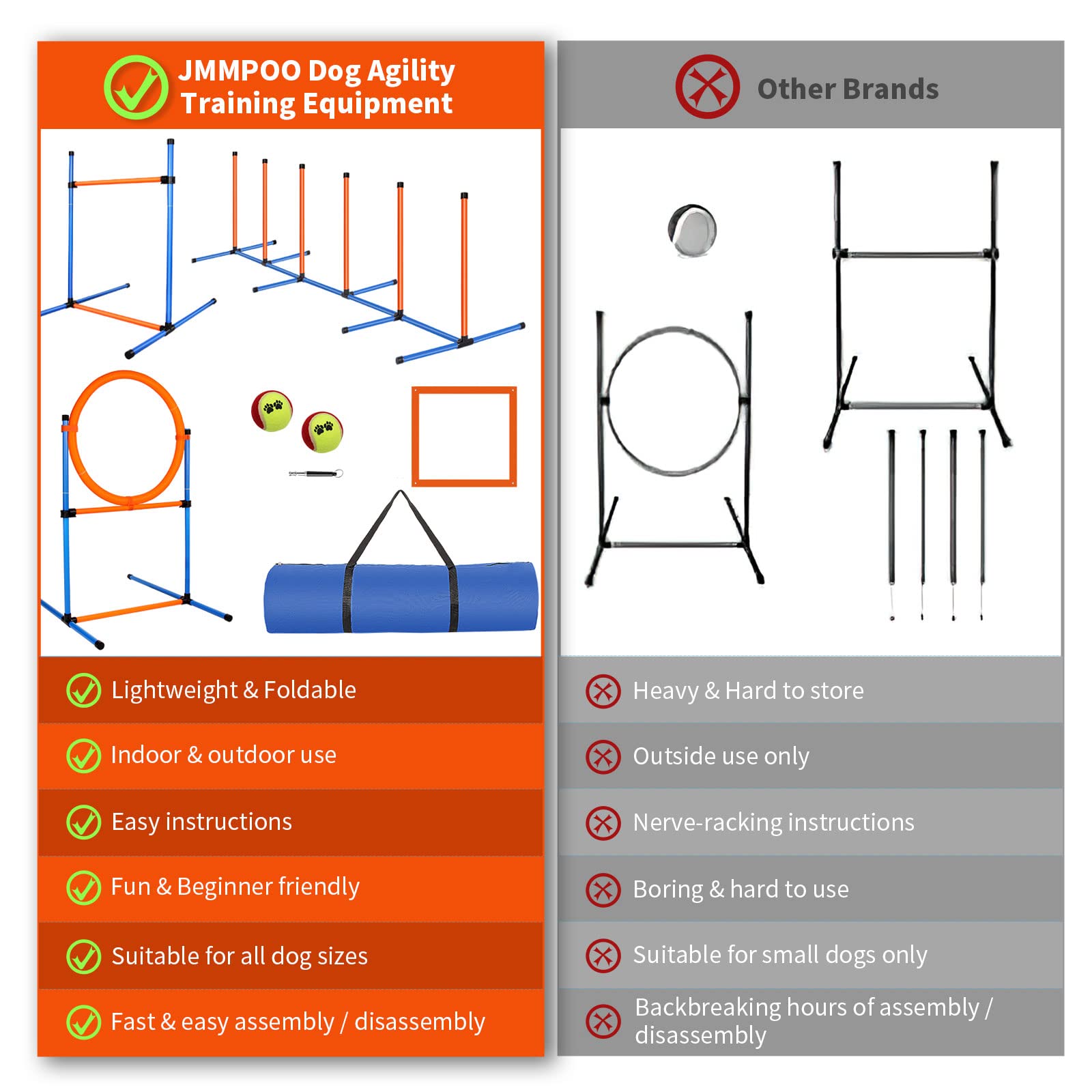 UNIQUE DOG AGILITY EQUIPMENT KIT: JMMPOO PET backyard obstacle course set gives you more options to build trust with your dogs and keep them healthy by exercising. Whether it is training for competition or just for fun, you should own this agility training equipment for dogs!