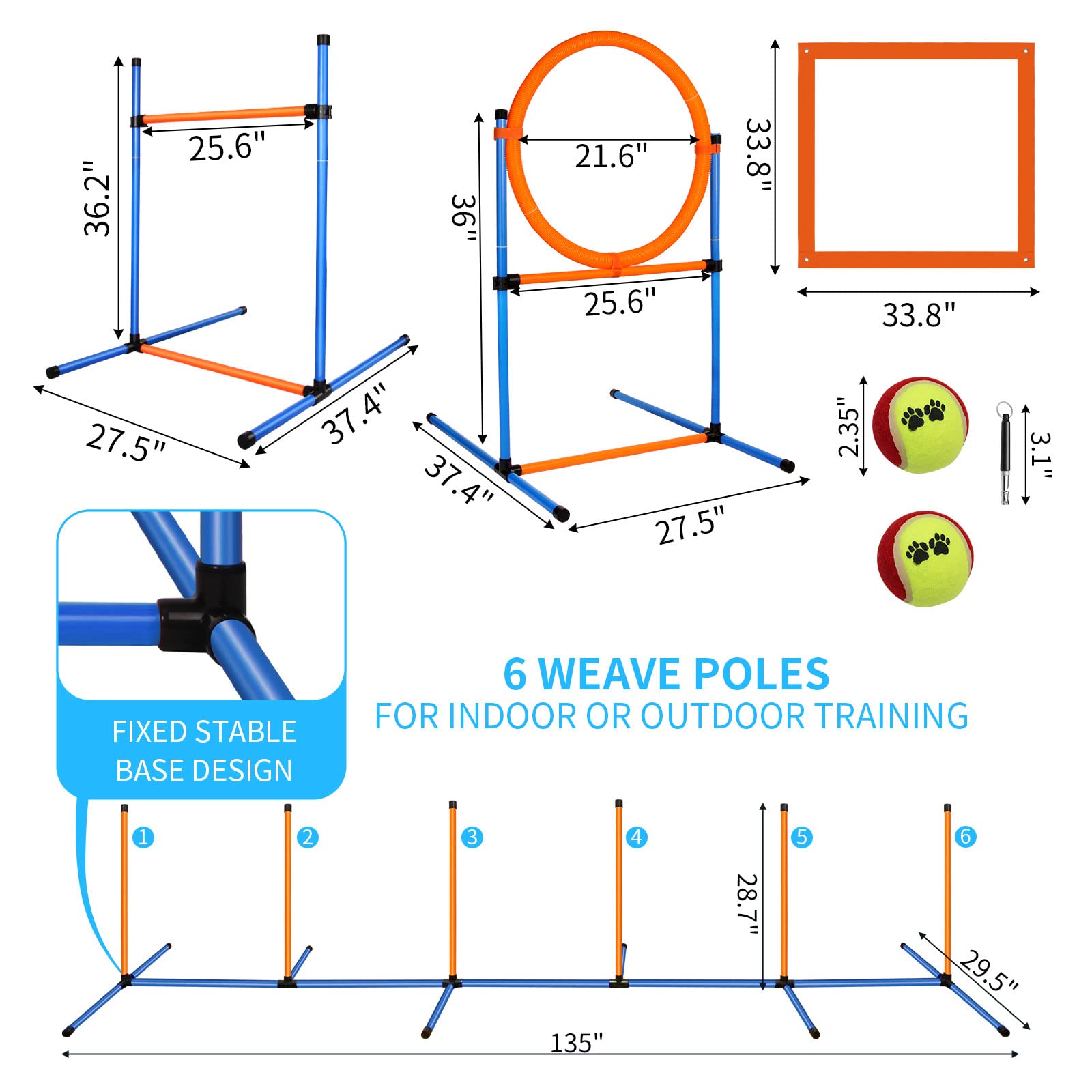 INDOOR/OUTDOOR & EASY SET-UP: Our agility course kit will bring you hours of fun with your dog and keep your pup in shape no matter the weather! It is lightweight, easy to set up and take down without tools in just minutes, and easy to carry to the outdoor or the indoor big stage!