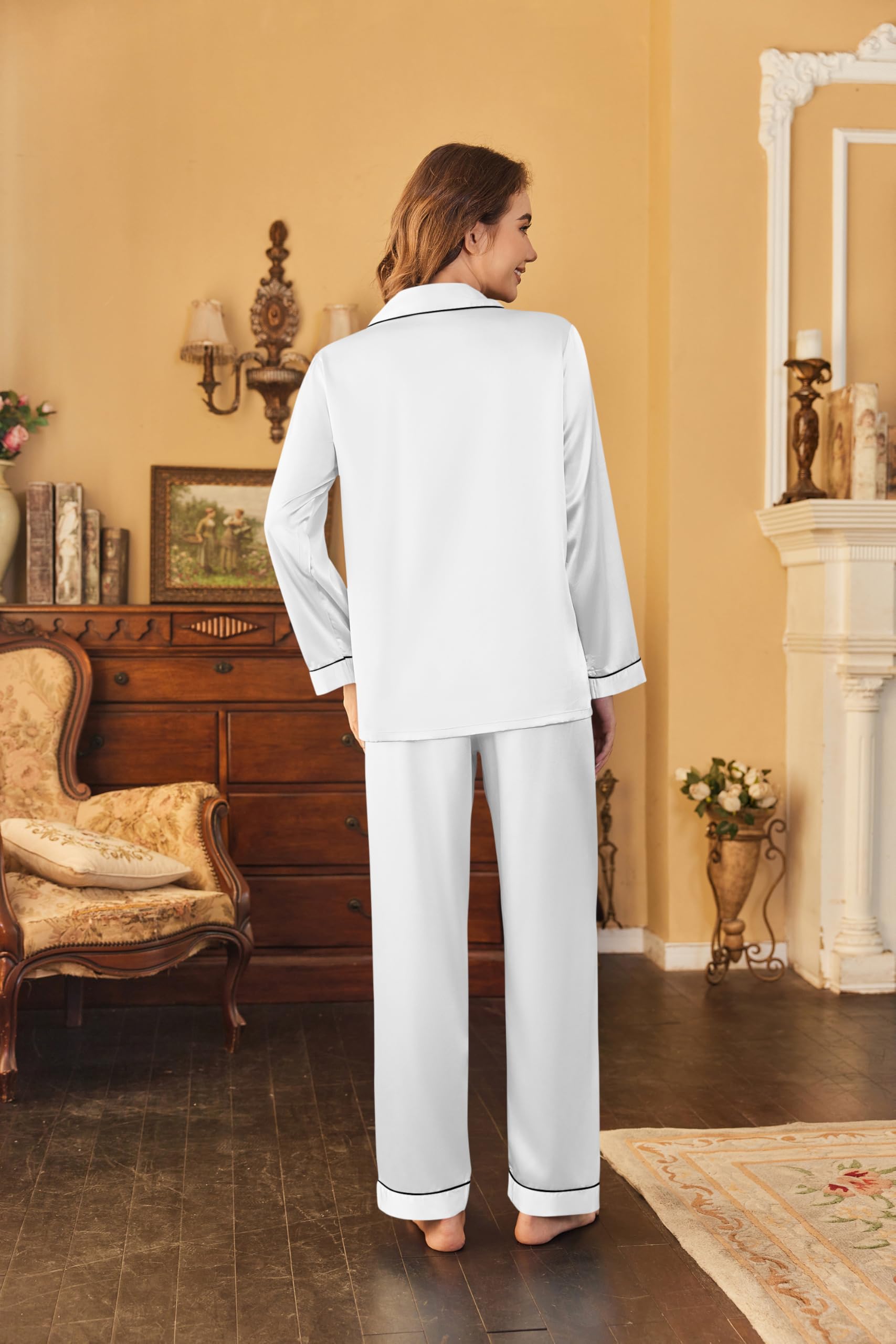 OCCASION:Women's long sleeve silk satin pajamas set perfects for daily sleepwear,outfit for women,go shopping,loungewear,bridal nightwear,pajama party,hotel,vacation.Pajamas shirt or pant is easy to match.Women's silk pajamas set is made of high quality imitation silk fabric,which is perfect for Halloween,Thanksgiving and Christmas gifts,Valentine's Day,Mother's Day,Anniversary,to your wife,girlfriend,mother,sister or daughter