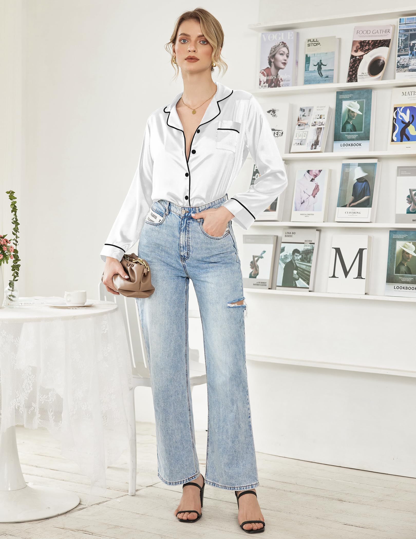 NOVEL MATCH STYLE:Pajamas shirt pairs with jeans,bag,belts,earrings,sandals as womens outfits for going out,casual daily look. Pajamas top+jeans/dress+highheels/boots+fashionable bag=Gorgeous fashion women.Pajamas bottom goes well with sexy cami top /loose knitted sweater /fashion bikini top or short T-shirt as lounging outfit.Refer to model pictures
