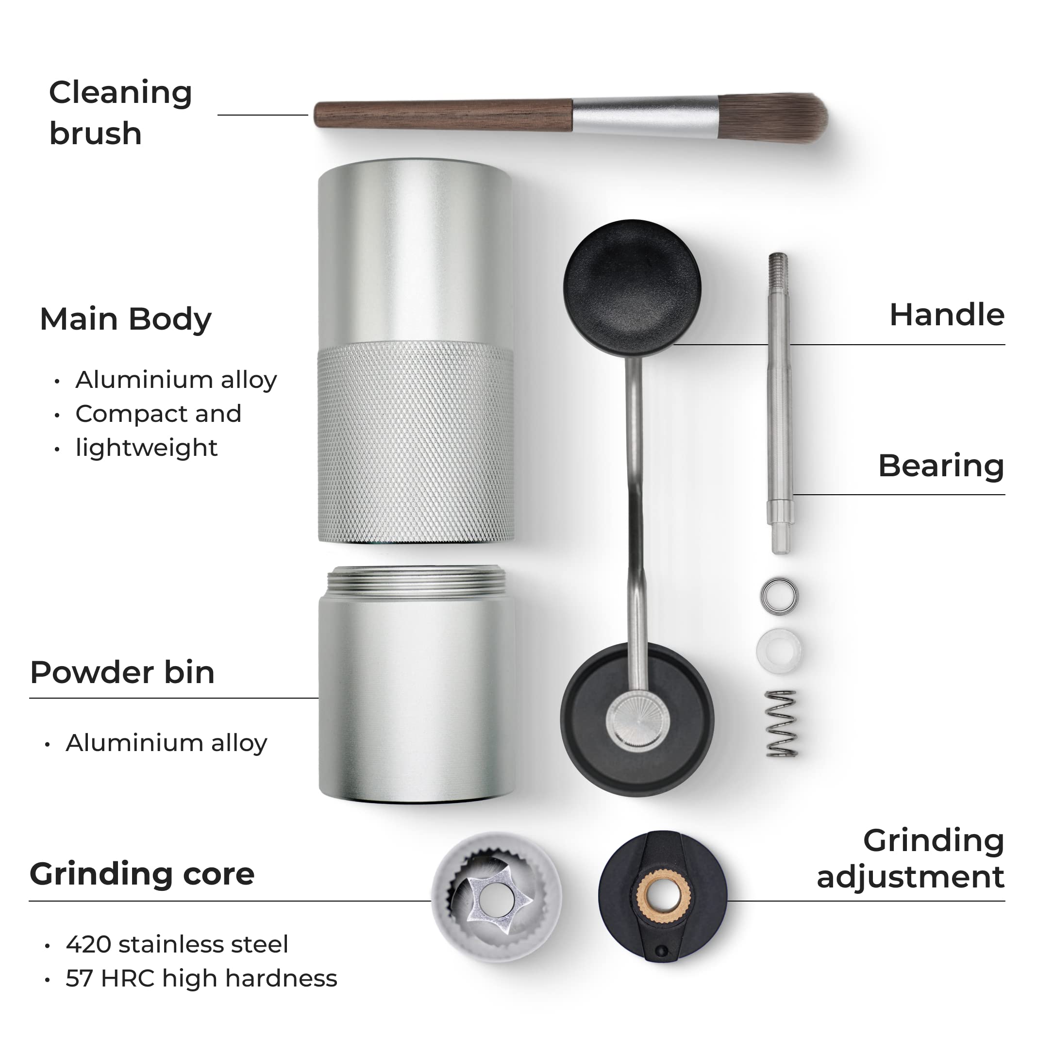 EASY DISASSEMBLING, CARRYING AND CLEANING – A simple twist can separate the parts for cleaning, no tool needed. A lightweight coffee grinder with a sense of luxury portability makes it ideal for outdoor use. Easy apart off cleaning thoroughly without any device. It is relatively easy to disassemble the coffee beans grinder for cleaning. With an espresso grinder brush inside the burr for superior cleaning.