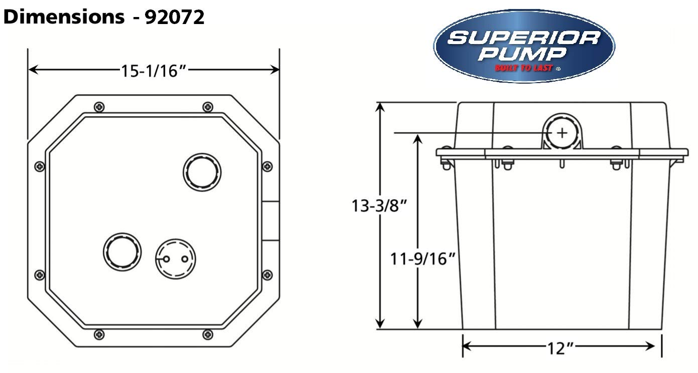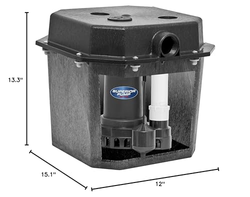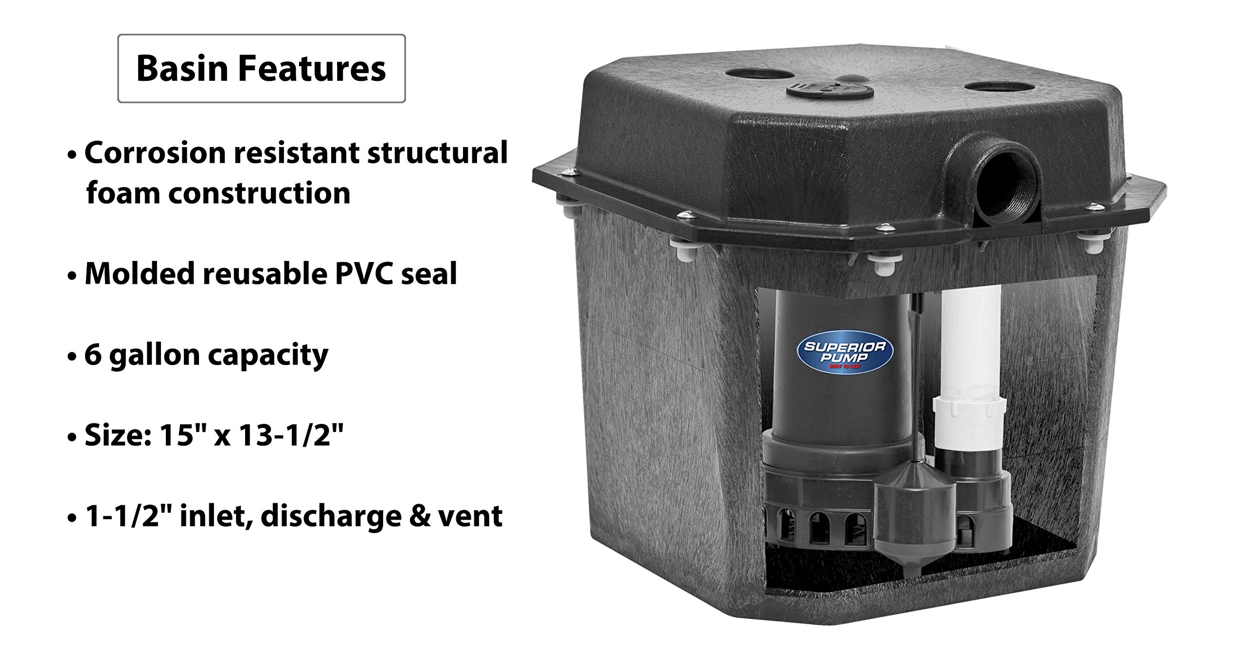 Product Description The Superior Pump 92072 pre-assembled Remote Sink Drain Pump System is ready to install. This kit works great for laundry tubs, washing machines, wet bars and dehumidifiers. Complete kit includes sump pump, check valve, basin and basin cover. Pump Features: The 1/3 HP submersible sump pump will move up to 48 gallons of water per minute. This pump is made of corrosion resistant thermoplastic and includes an adjustable tethered float switch with piggy back plug to automatically turn the pump on/off. The pump offers a powerful, yet energy efficient (4.1 Amp) thermally protected motor for longer life and durability. Featuring a thermoplastic impeller, 1-1/2 inch FIP discharge and 10 foot, replaceable, water proof power cord. Sump pump has side inlets for increased water flow, will handle 3/8 inch solids and is equipped with a suction screen on the bottom. Pump is UL/CUL listed and CSA certified. Basin Features: The 6 gallon basin is constructed from corrosion resistant structural foam and includes a high quality molded reusable PVC seal. Pre-plumbed with a 1-1/2 inch discharge pipe and check valve this kit is ready to install and is backed by a 1 year warranty. From the Manufacturer Superior Pump is a family owned and operated Pump Company specializing in residential / light commercial duty pumps. Headquartered in Minneapolis, Minnesota, Superior Pump was founded in 1999 after spending years in the pump industry dating back to the 70's, and with a plumbing background starting in St Paul Minnesota dating all the way back to 1885. Superior Pump adheres to our strong core family values, selling the absolute highest quality product possible. Known for building durable pumps, Superior Pump concentrates on quality throughout the engineering, manufacturing and testing processes. Quality products, strong warranties, excellent USA based customer service - Superior Pumps Built to Last!