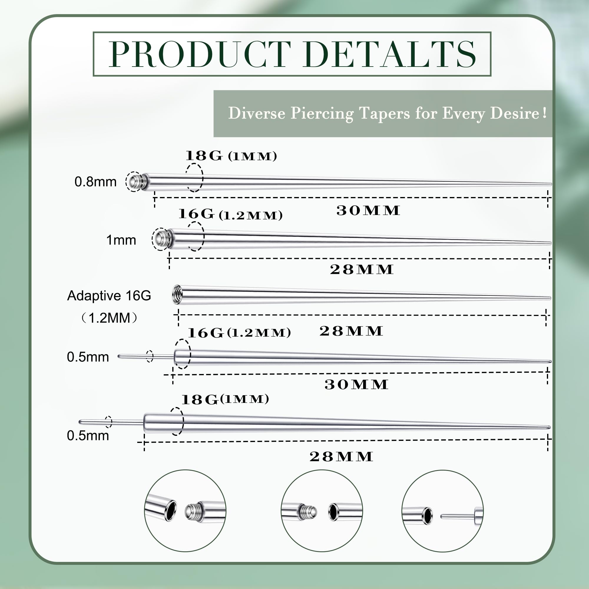 Hypoallergenic Piercing Tools : Crafted from stainless steel, nickel-free and lead-free, this stainless steel piercing tool kit is not easy to rust and gentle on sensitive skin. Finely polished, each piercing taper has smooth surface without burrs or sharp edges for easy insertion. This piercing insertion tool is reusable for changing women's body piercing jewelry and won't hurt any body site