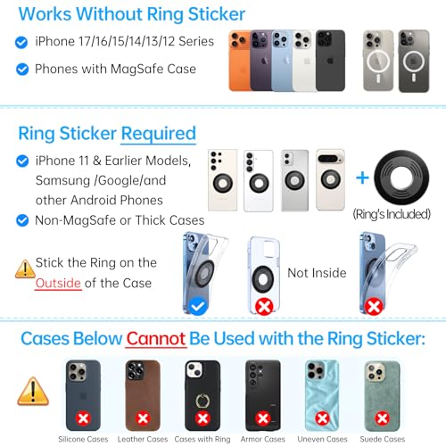 ✅【Designed for Magsafe】This vacuum magnetic phone holder works perfectly with iPhone 17 Pro Max/ 16/ 15/ 14/ 13/ 12 series and all MagSafe-enabled devices. For Android users or non-MagSafe cases, simply use the included metal ring (adheres to phone or case) to enjoy the same magnetic locking power. Snap your phone on in one second with one hand—clean, stable, and seamless.