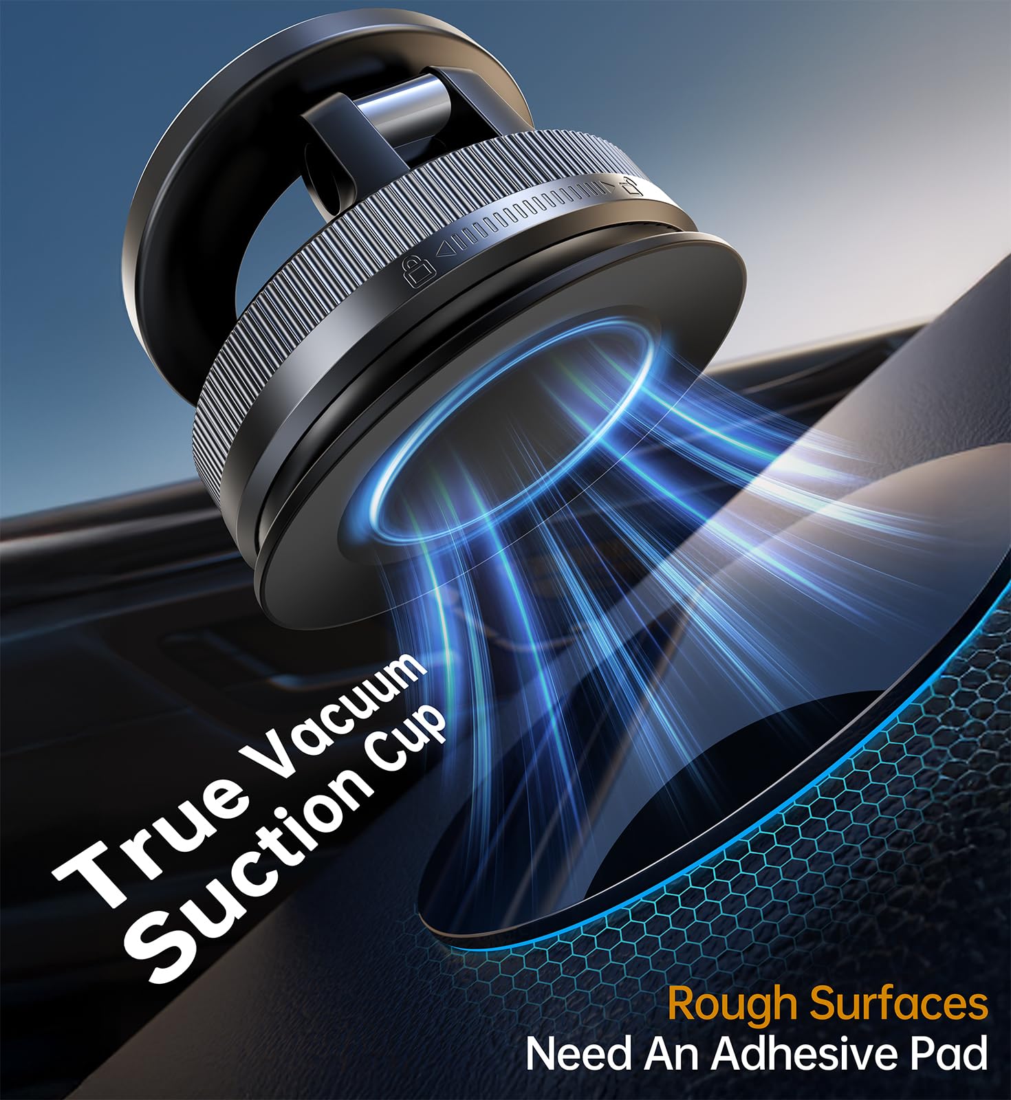 ✅【Twist-Lock Enhanced Vacuum Suction】-This cell phone mount uses advanced rotating-lock vacuum suction, boosting grip strength by 80% compared to traditional press-on mounts. Simply twist the dial to secure it on flat surfaces like mirrors, windshields, center consoles, or side windows. For textured or grainy dashboards, an included smooth adhesive pad provides a rock-solid mounting surface—just attach the vehicle mount to the pad and enjoy secure placement.