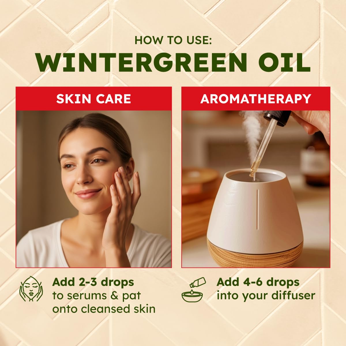 Gleam in smooth-looking complexions. Wintergreen essential oil for skin adds a nurturing touch to potentially moisturize and restore smoother-looking skin. Add essential oils for skin wintergreen to skincare regimens to nourish dull-looking skin.