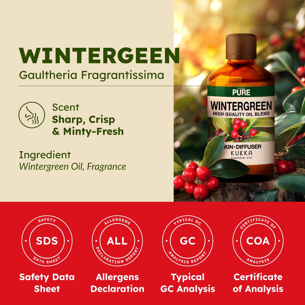 Use wintergreen oil in your diffuser to fill your living area with a cool, invigorating fragrance. Perfect for creating an atmosphere of renewal, its minty aroma helps soothe your space and create a centring environment for work and concentration.