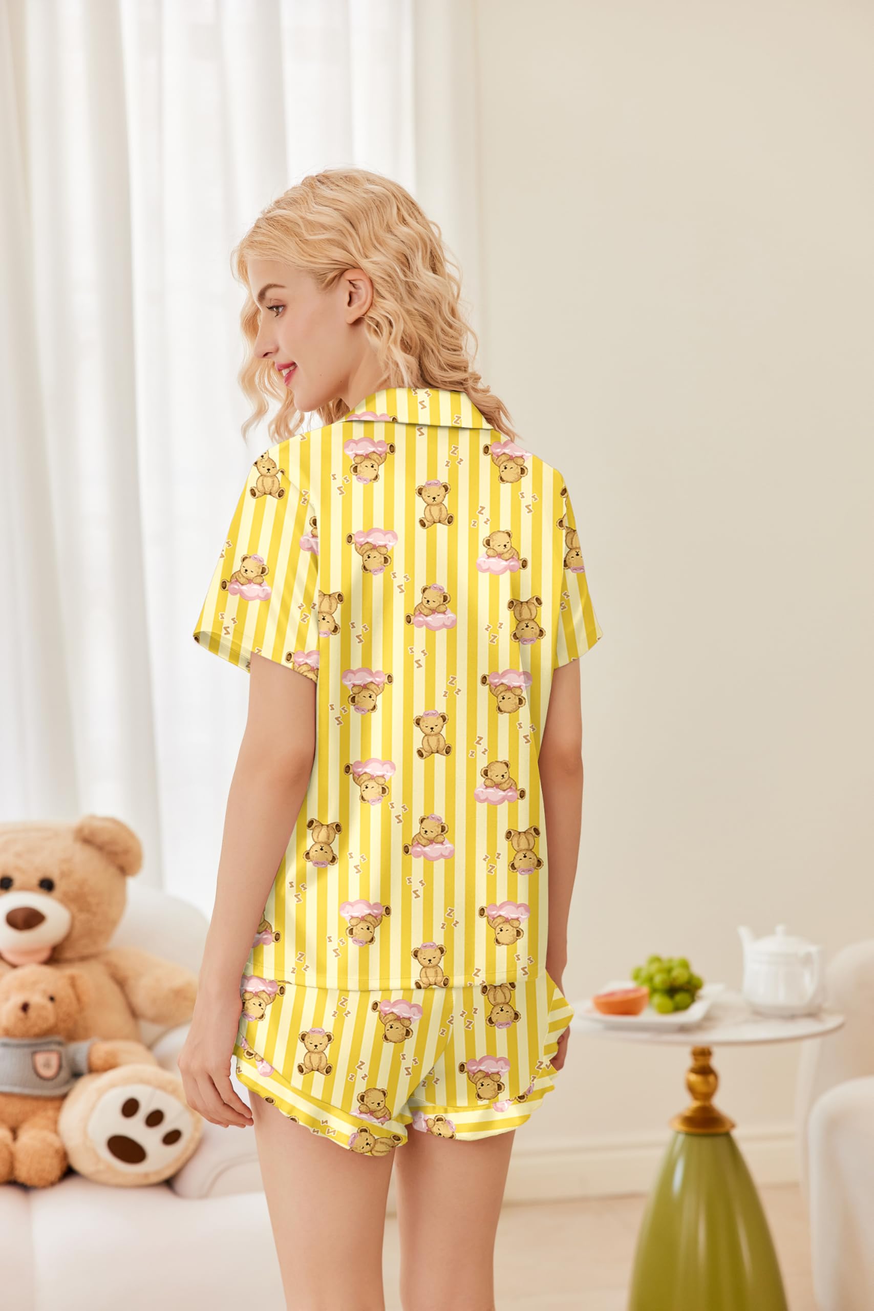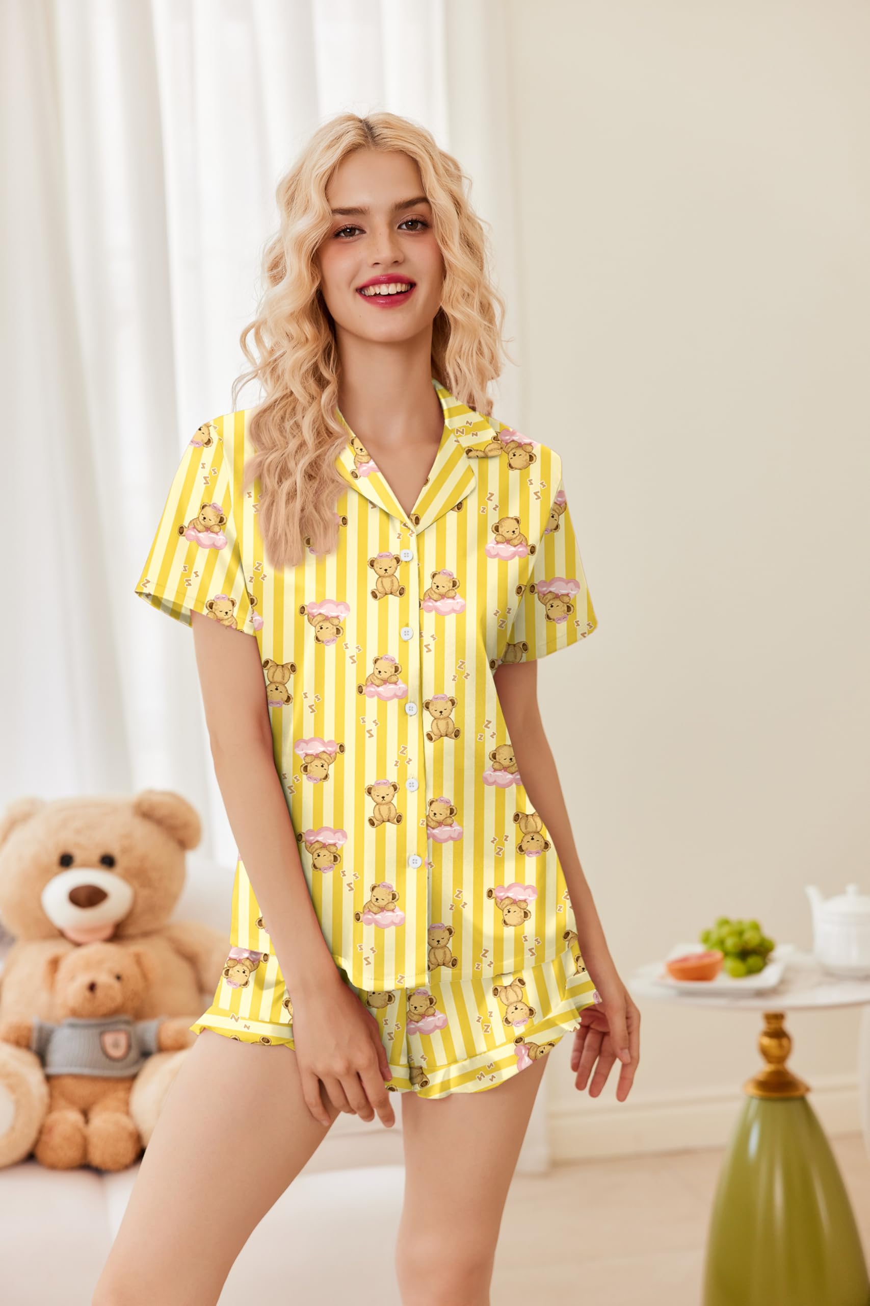 ใPajama Topใ:Women's short sleeve pajamas set with classic stripe, sleepshirt hits at hip , turn-down collar, Full Button Design is easy to put on and take off