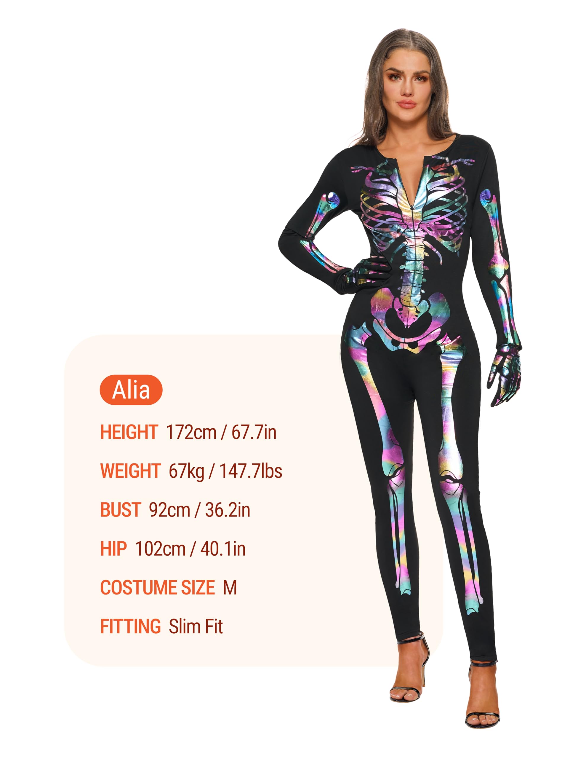 Set Includes: Our Halloween Costume Includes 1 Rainbow Skeleton Printed Adult V-Neck Bodysuit and 3 Pair of Gloves (Friendly Reminder: There Is No Pattern on the Back.)