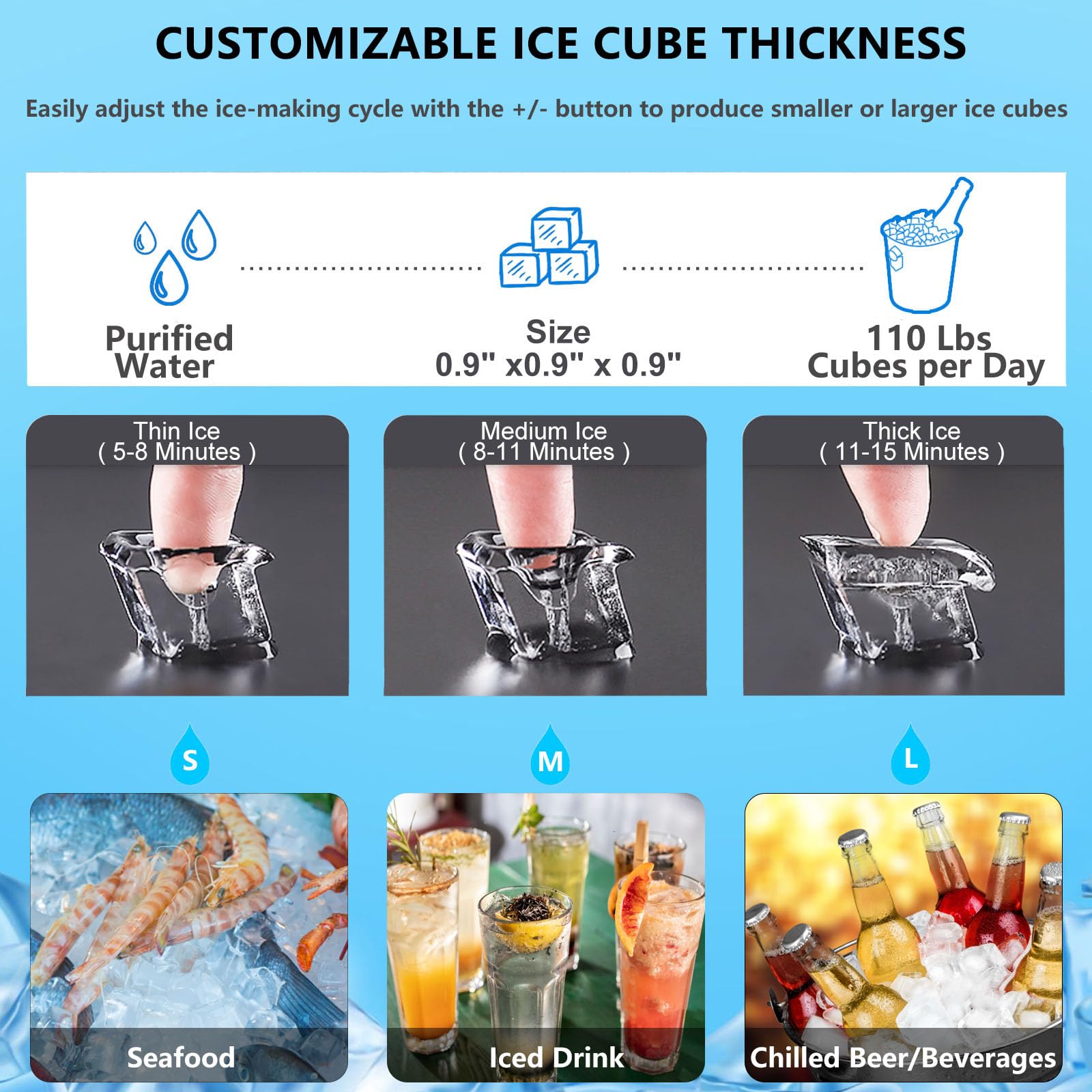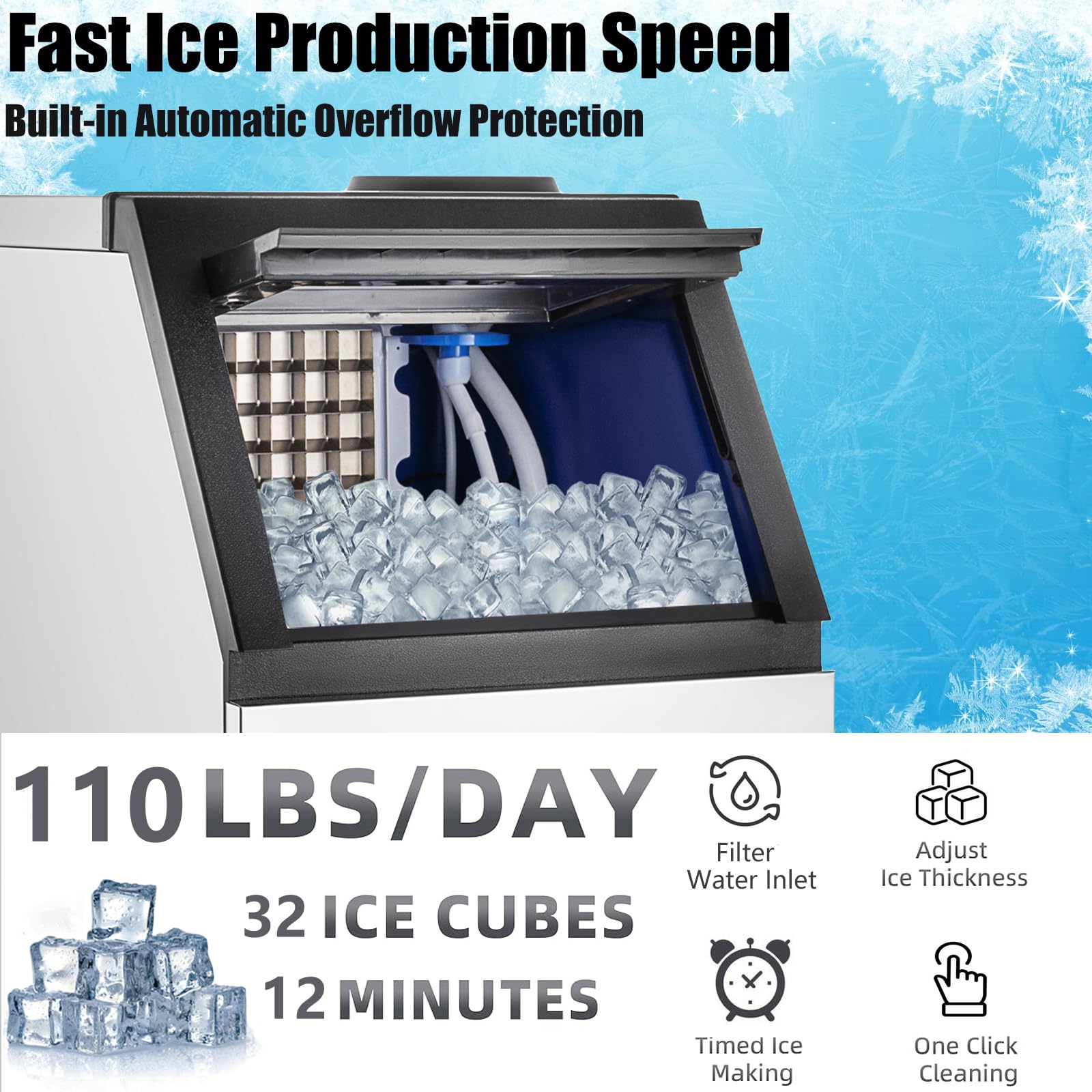 【High Ice Production & Large-Capacity Storage】The commercial ice maker delivers an impressive 110 lbs of clear, square-shaped ice cubes per day, with each cube sized at 0.9"x0.9"x0.9", perfect for cocktails, cold beverages, seafood displays, and more. The built-in 33 lbs ice storage bin ensures a steady supply even during busy hours. Equipped with 32-piece ice tray, it efficiently produces ice in large batches. A reliable solution for restaurants, bars, hotels, coffee shops, and other fast-paced environments.