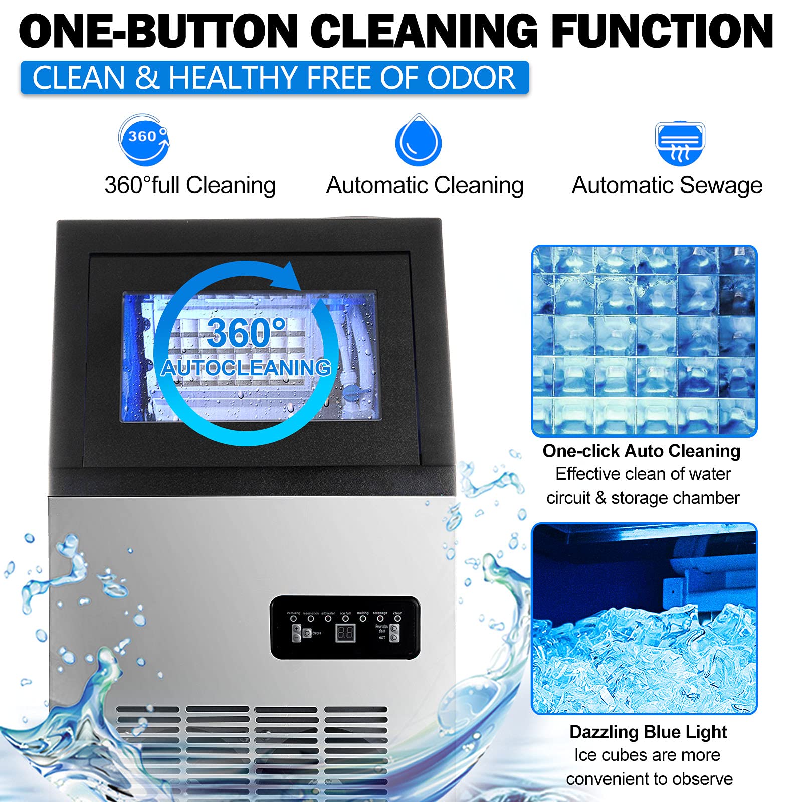 【30-Minute One-Touch Self-Cleaning & NANO Blue Light Sterilization】With a single press, activate the automatic cleaning cycle that runs for 30 minutes—removing scale, residue, and impurities without manual scrubbing. Integrated NANO blue light provides continuous sterilization and illumination, maintaining the cleanliness of every ice cube and enhancing hygiene standards.