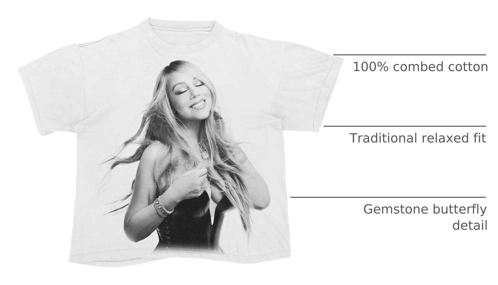 Back - Screen printed Mariah Carey's Here For It All logo with gemstone butterfly detail